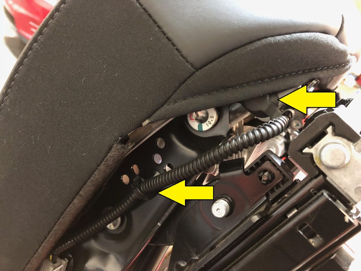 注1 个连接器,1 个固定夹;确保线束未排布在座垫和框架之间,以避免摩擦