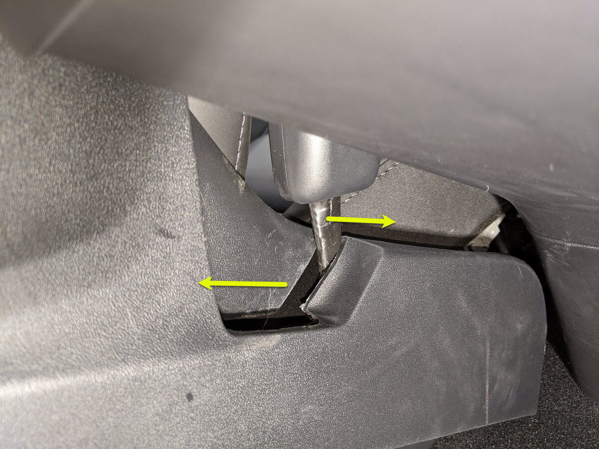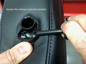 注按压头枕柱周围材料,露出释放夹;确保释放工具的两个凸舌与固定弹簧接合;将释放工具旋转入位;为清晰起见,图中的头枕已拆下
