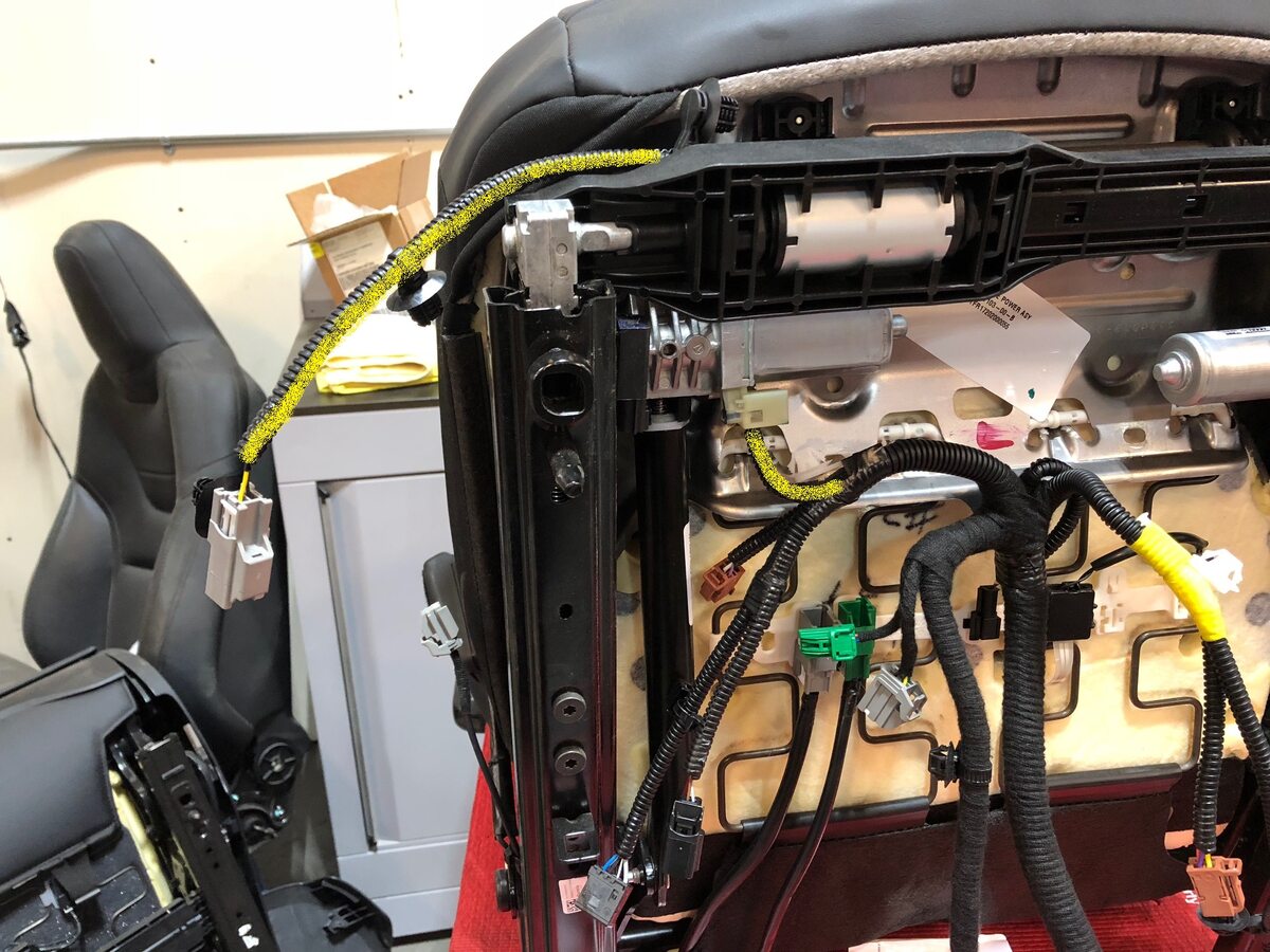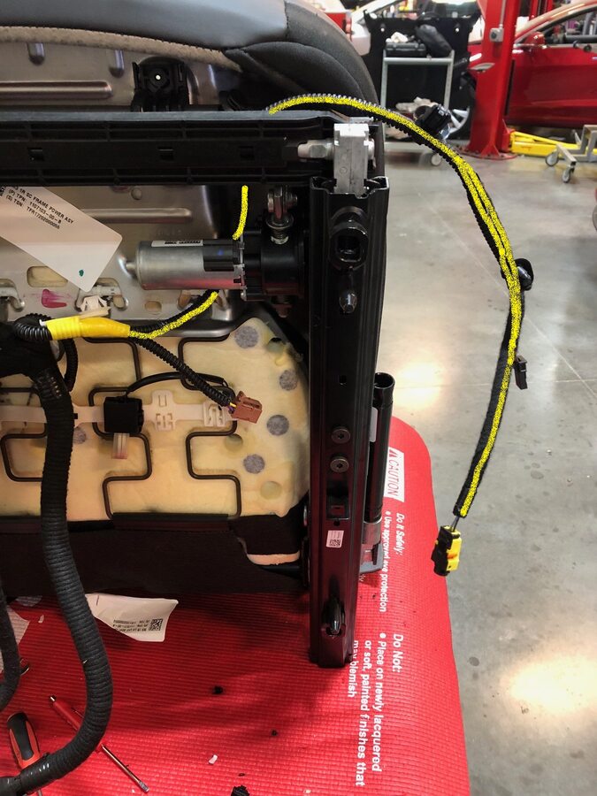 注将线束排布在座椅升降电机和倾斜电机下方,将线束支腿放置在正确位置;稍后将安装线束夹