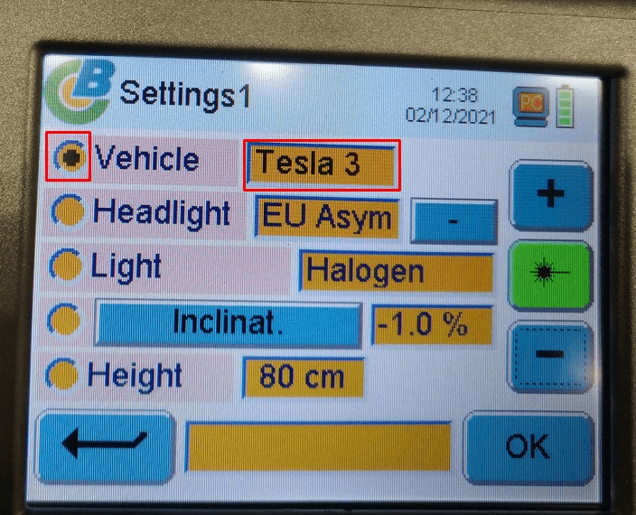 - 在前照灯测试仪工具上,选择Vehicle,然后使用+或-按钮将车辆类型设为Tesla 3。
