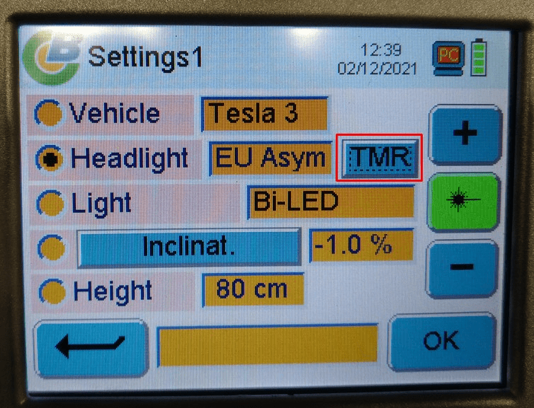 - 在前照灯测试仪工具上,选择Headlight,使用+或-按钮将前照灯类型设为EU Asym,然后使用EU Asym字段旁边的小-按钮选择TMR。