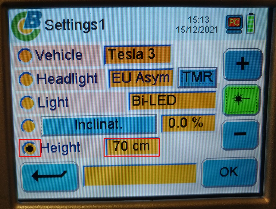 - 在前照灯测试仪工具上,选择Height,然后使用+或-按钮将高度设为70 cm。