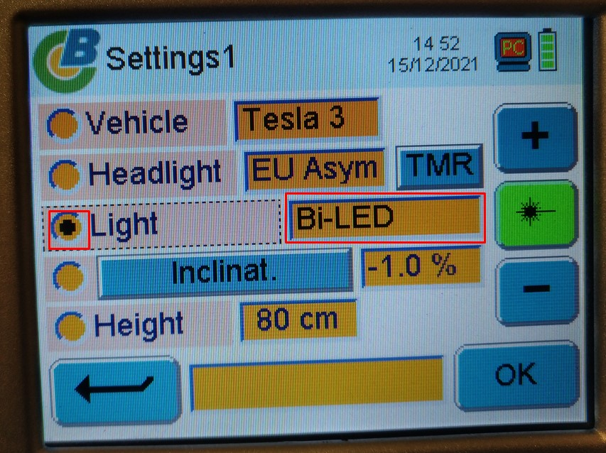 - 在前照灯测试仪工具上,选择Light,然后使用+或-按钮将车灯类型设为Bi-LED。