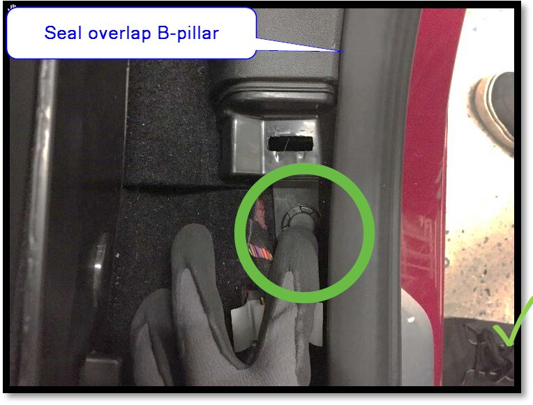 注2x clip, 3 guide tabs, Align the 2 front tabs then align the slot with harness bracket and then push rear clip to secure to lower B-pillar, Fully seat seal along trim.