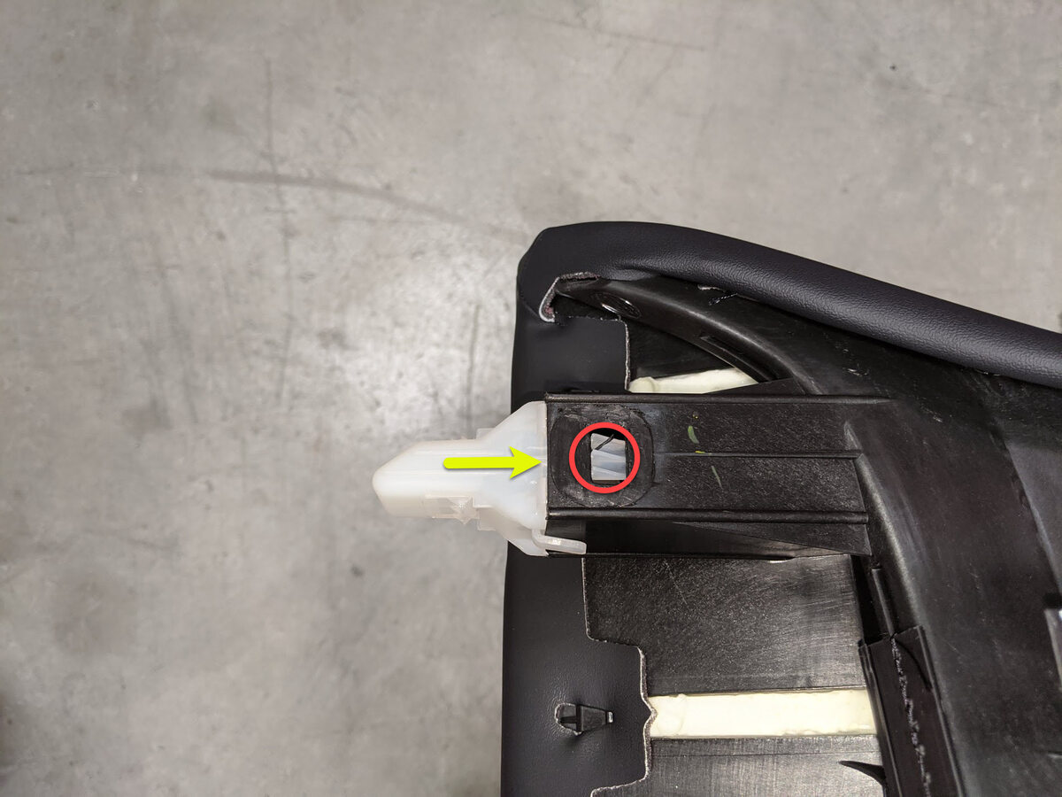 注Move front edge down and slide back section up to ease positioning, Install seat harness into clip.