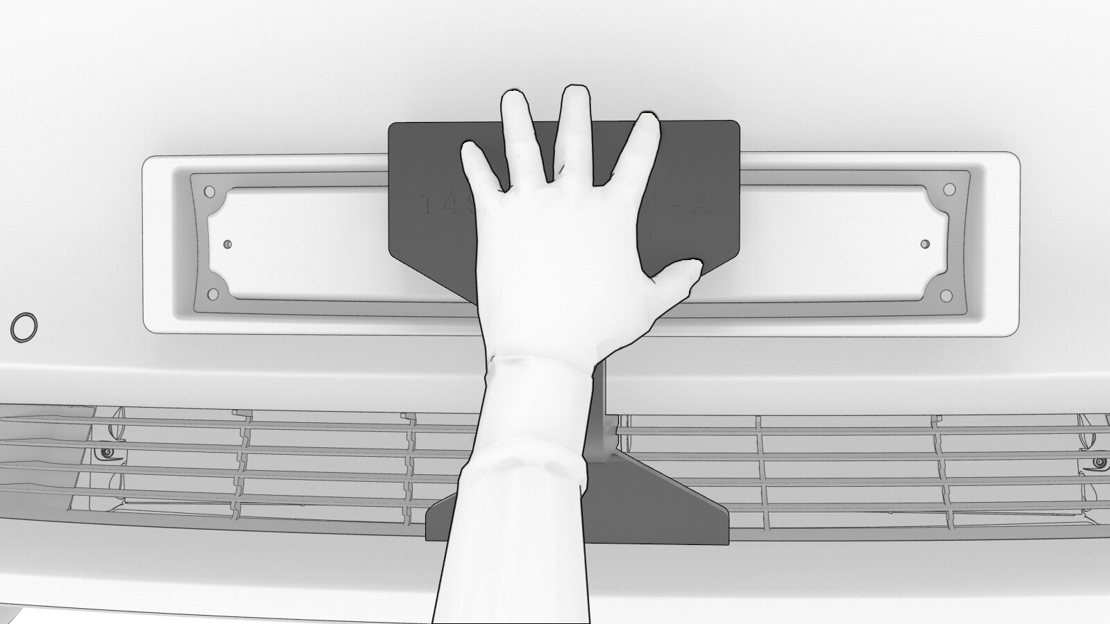 NoteApply enough force on the head of the jig causing an even contact surface with the front fascia grille and the front license plate bracket.NoteMake sure to hold the jig by placing your hand on the head of the jig.