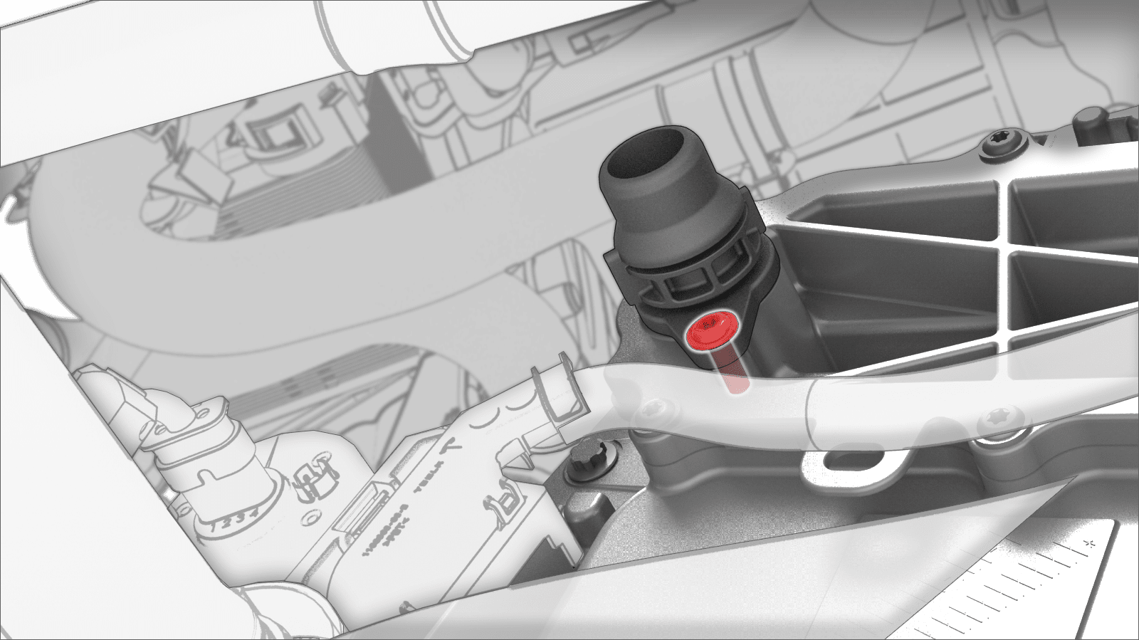 - 如果速度在 7000 RPM 左右徘徊,则说明泵存在气锁状况。请重新执行真空加注。继续添加冷却液并排空空气,直至冷却液液位介于罐上的 NOM 与 MAX 线之间。