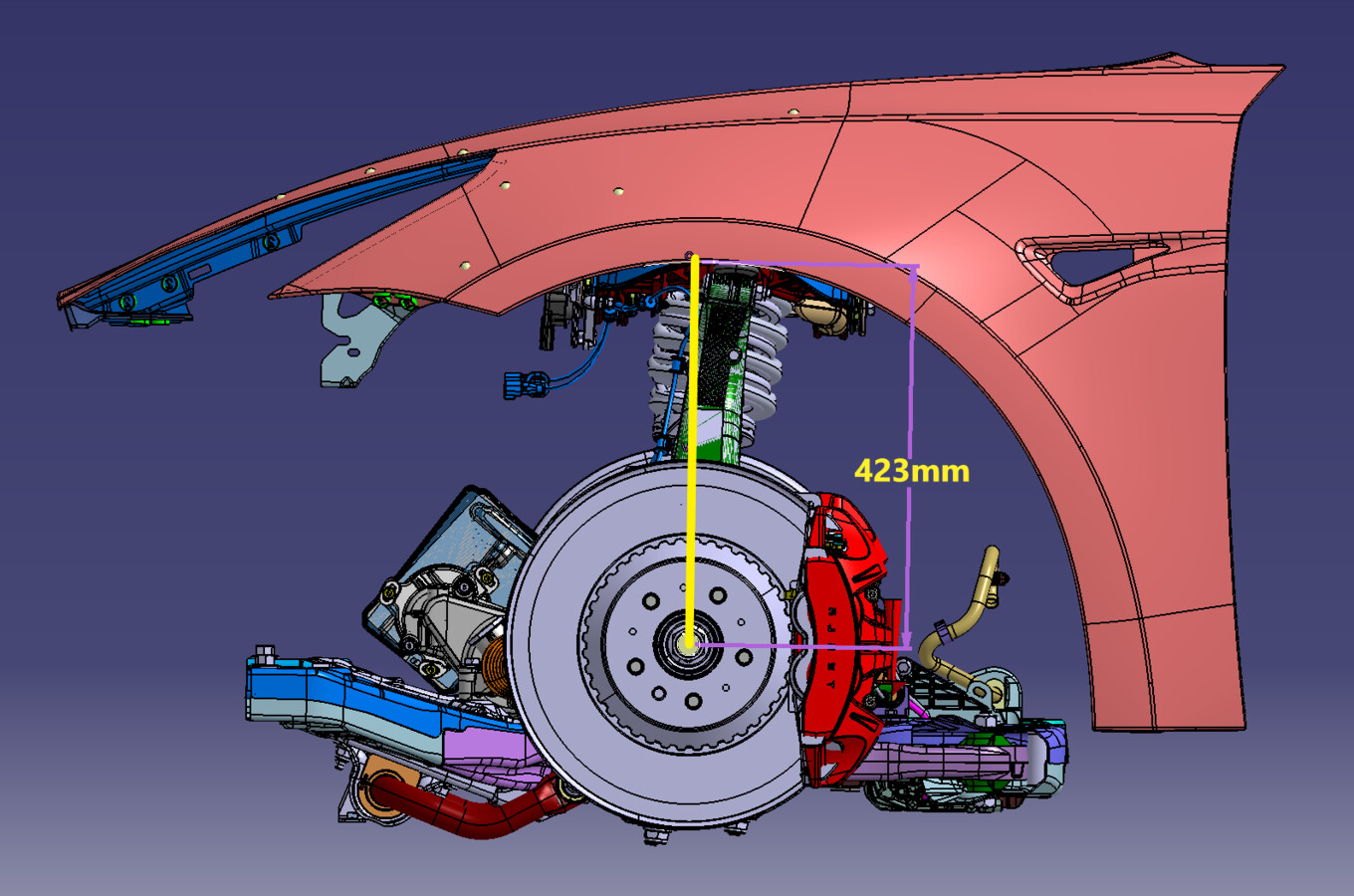 在左前轮毂轴承上安装一个轮毂轴承千斤顶适配器,然后使用支架将左前悬架支撑在行驶高度(423 毫米)。