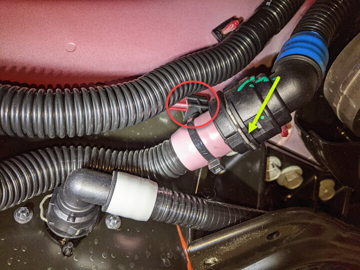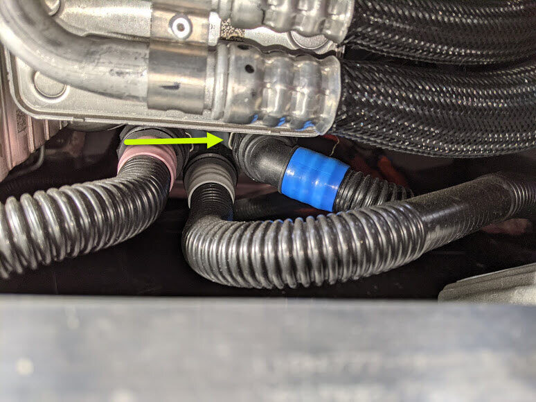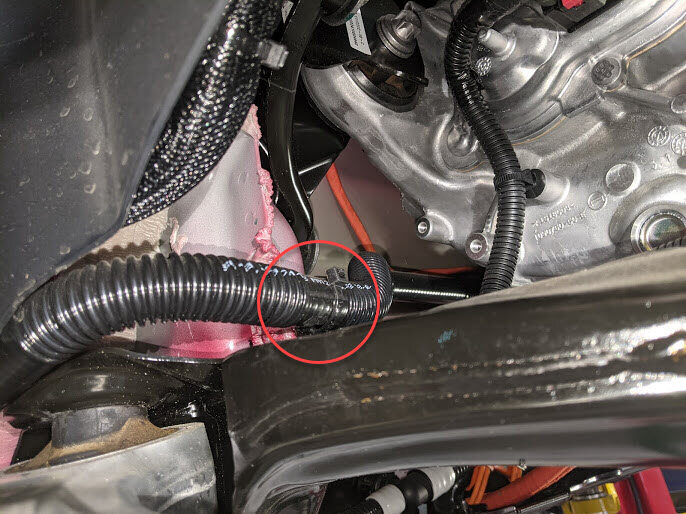 注2x clips, 2x plugs, Lower hose located on RH front of HV battery, Plug both hose ends