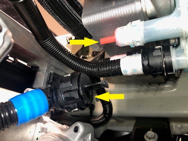 注1x spring clip, 2x plugs, Install plug onto lower end of hose to avoid coolant loss, Remove plug from Supermanifold, Perform push-pull-push test to make sure hose is fully engaged