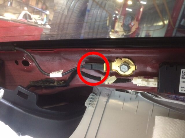 - Connect the LH antenna filter harness connector to the LH C-pillar ground.