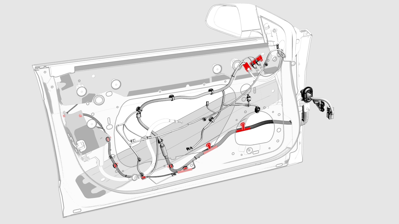 - 将电线线束连接器 (x4) 推过 LH 前车门隔板,然后从车门上拆下线束。