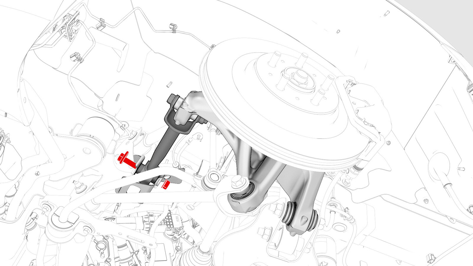 - 用油性记号笔在凸轮螺栓凸角和后副车架上标出证示标记,以便稍后在左后止推杆安装期间重新对准两者。