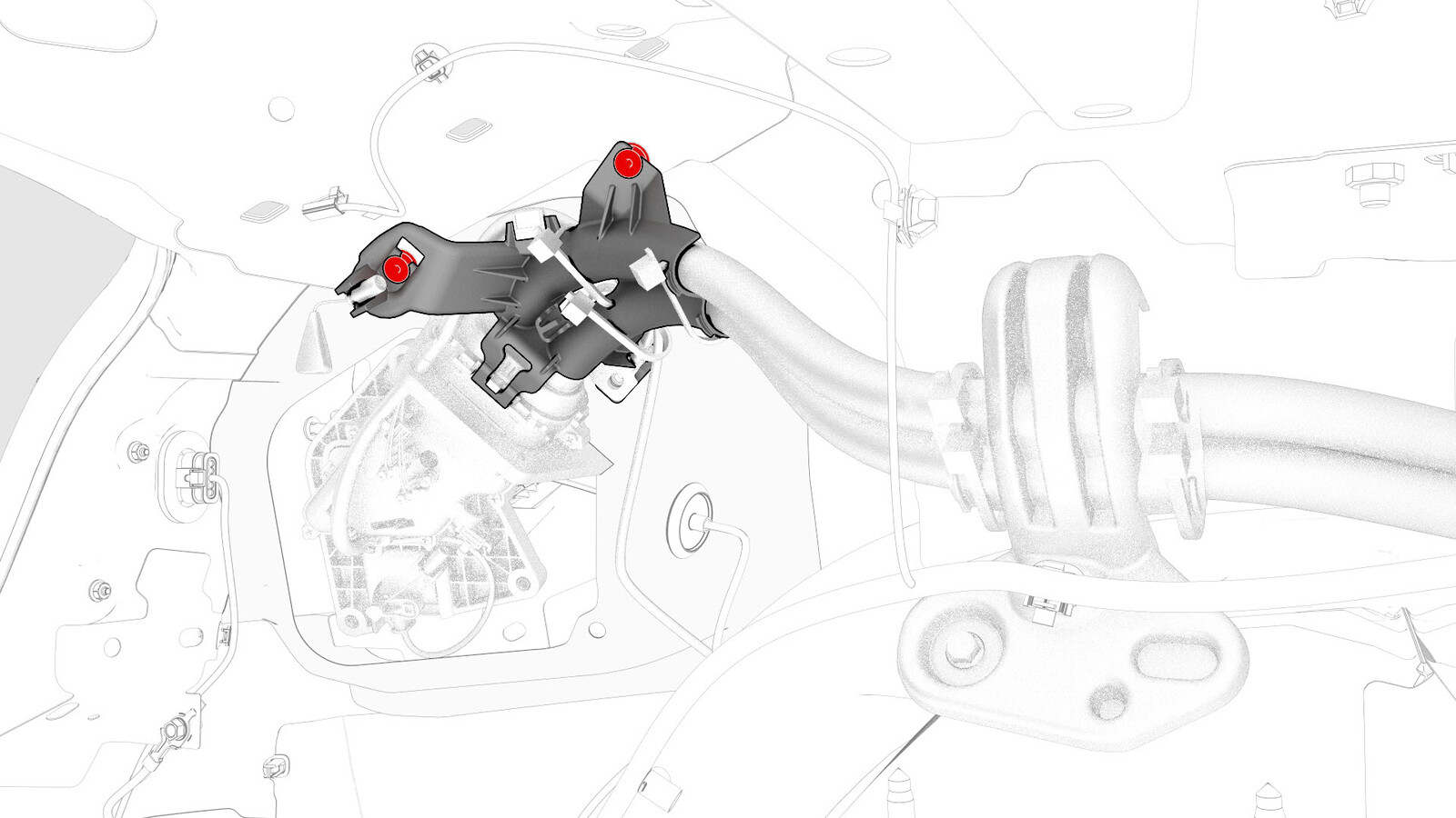 - 如图所示,将传动装置线束定位到支架总成上,然后按照与旧卡子相同的位置紧固缠绕线束的电缆扎带。