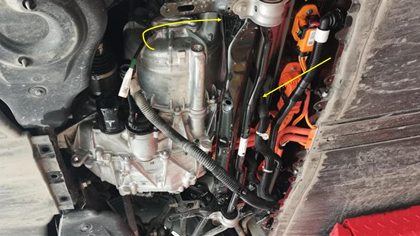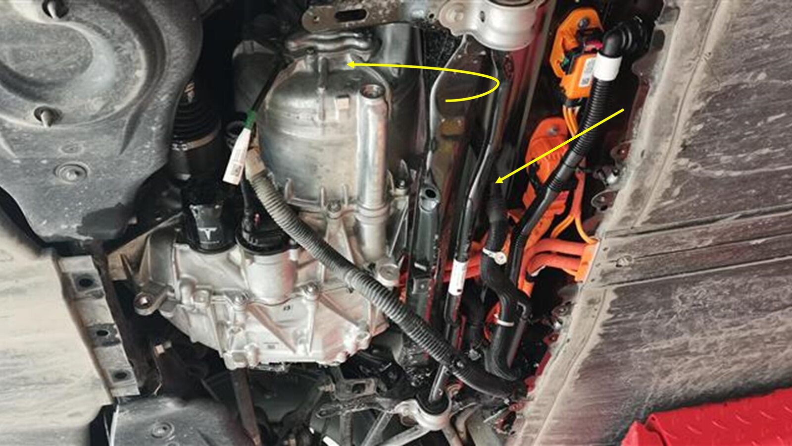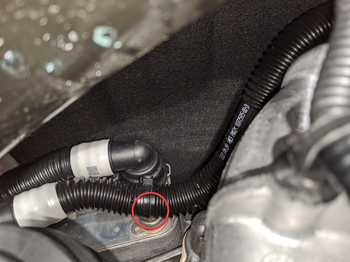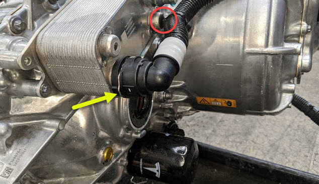 注1x spring clip, 2x plugs, Lower hose located at RH rear of HV battery, Use shop towel to clean any residue coolant if necessary, Coolant loss greater than 1 L will require vacuum fill