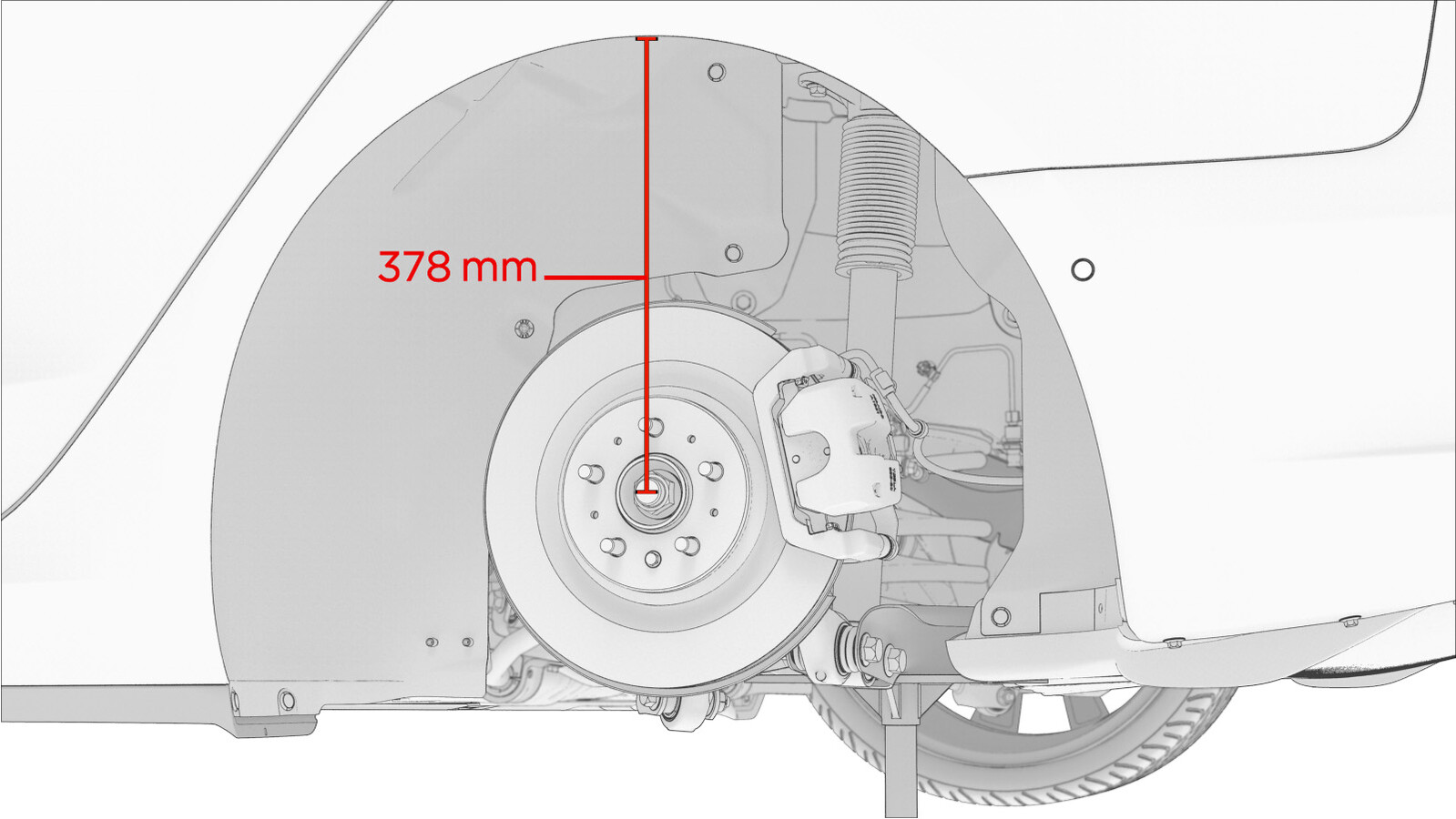 - 测量轮拱内衬顶部边缘与后轴中部之间的距离,确保后悬架设置为行驶高度:距离应为 378 毫米。
