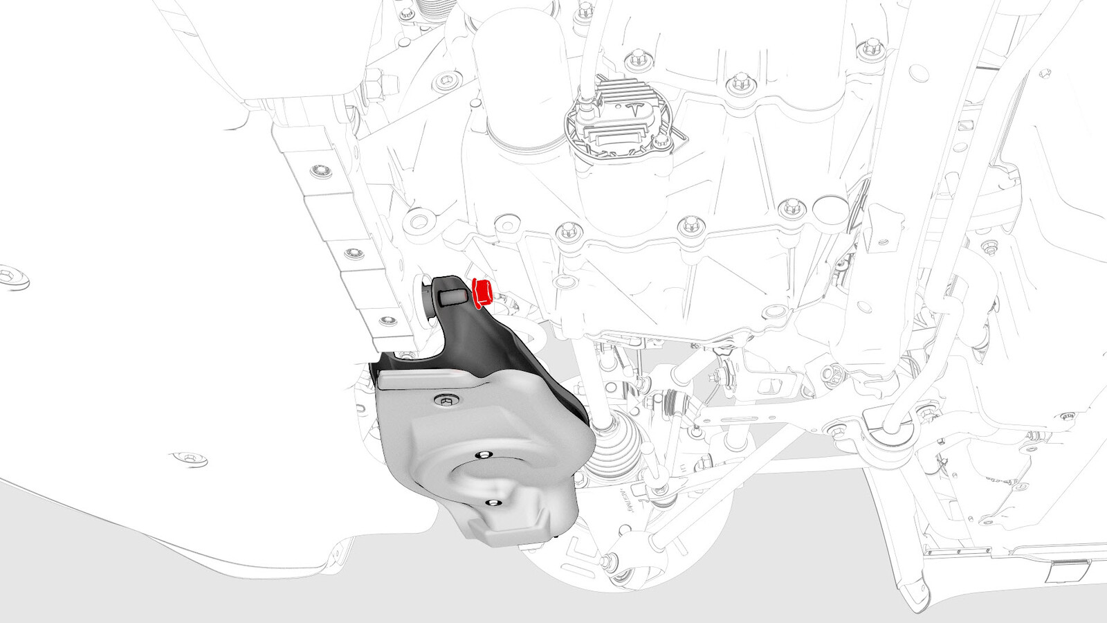 - 将后扩散器移到一旁,然后将后侧车身高度扭矩工具的顶部插入副框架孔中。
