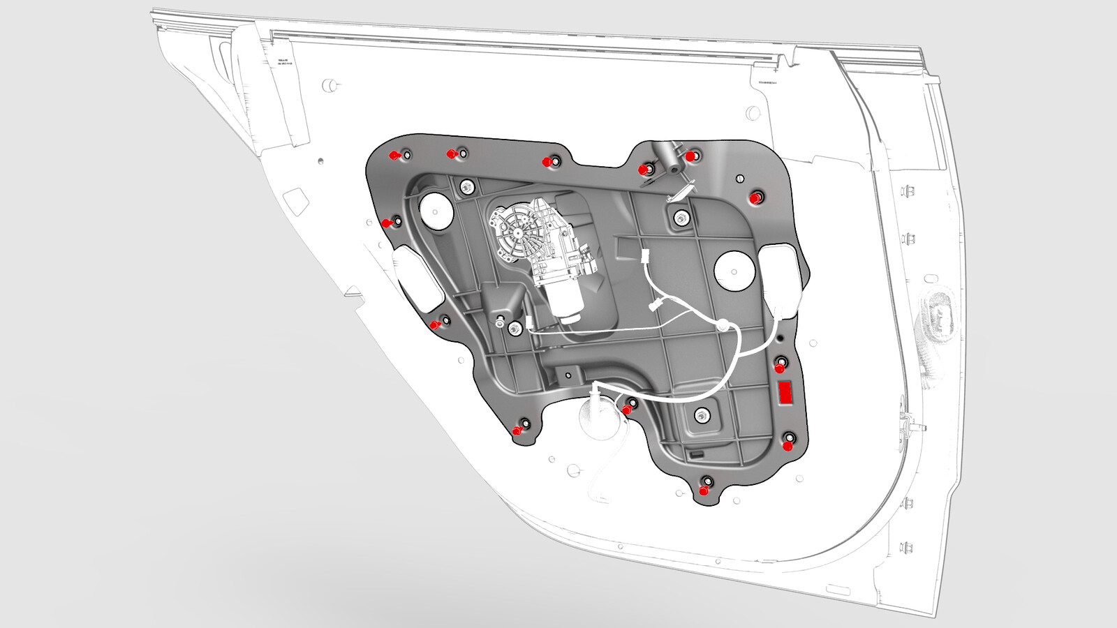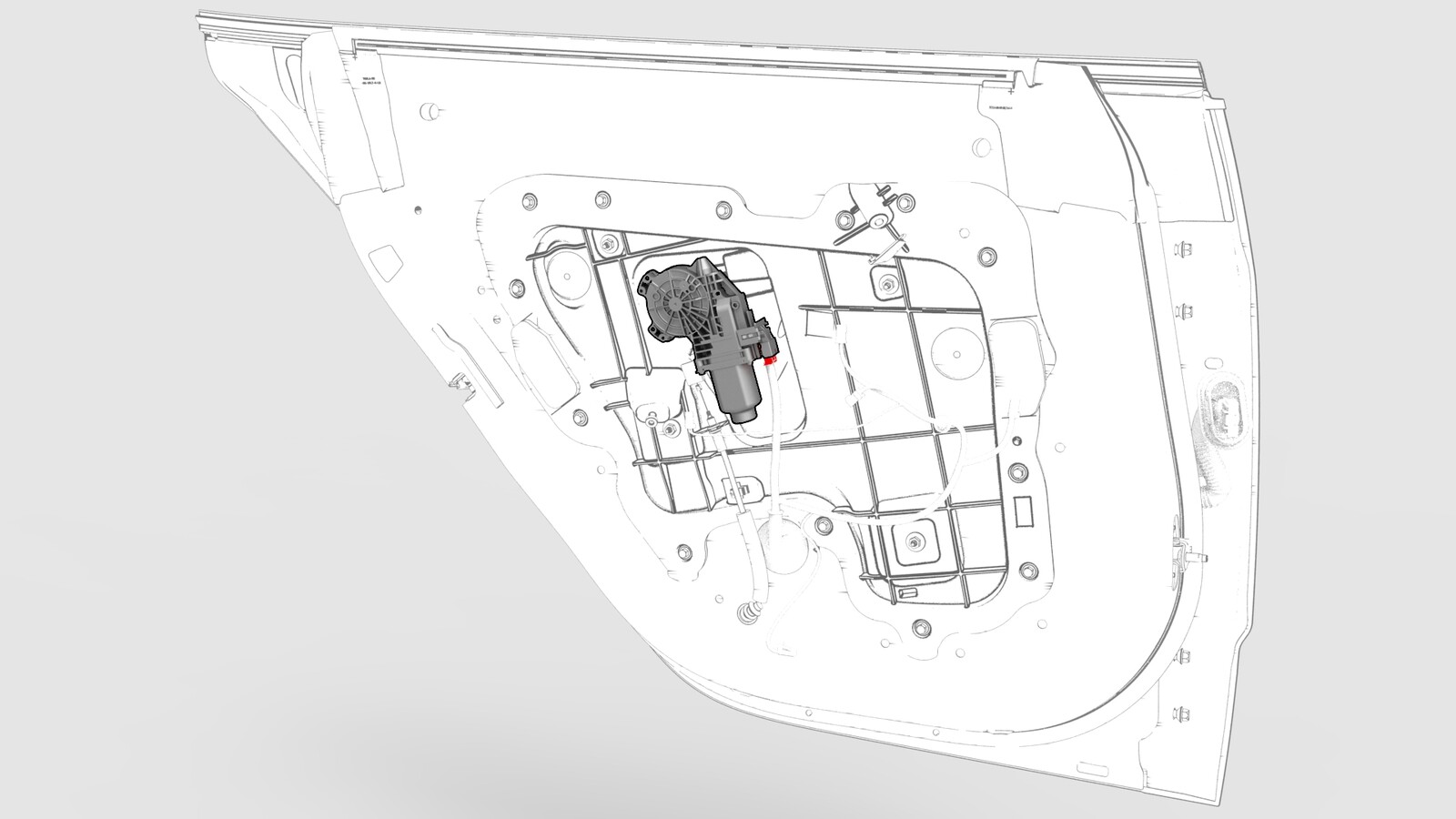 - 拆卸螺钉(13 个),松开将左后车窗电机/升降器总成固定到左后车门的金属卡子,然后将总成从车门上拆下。