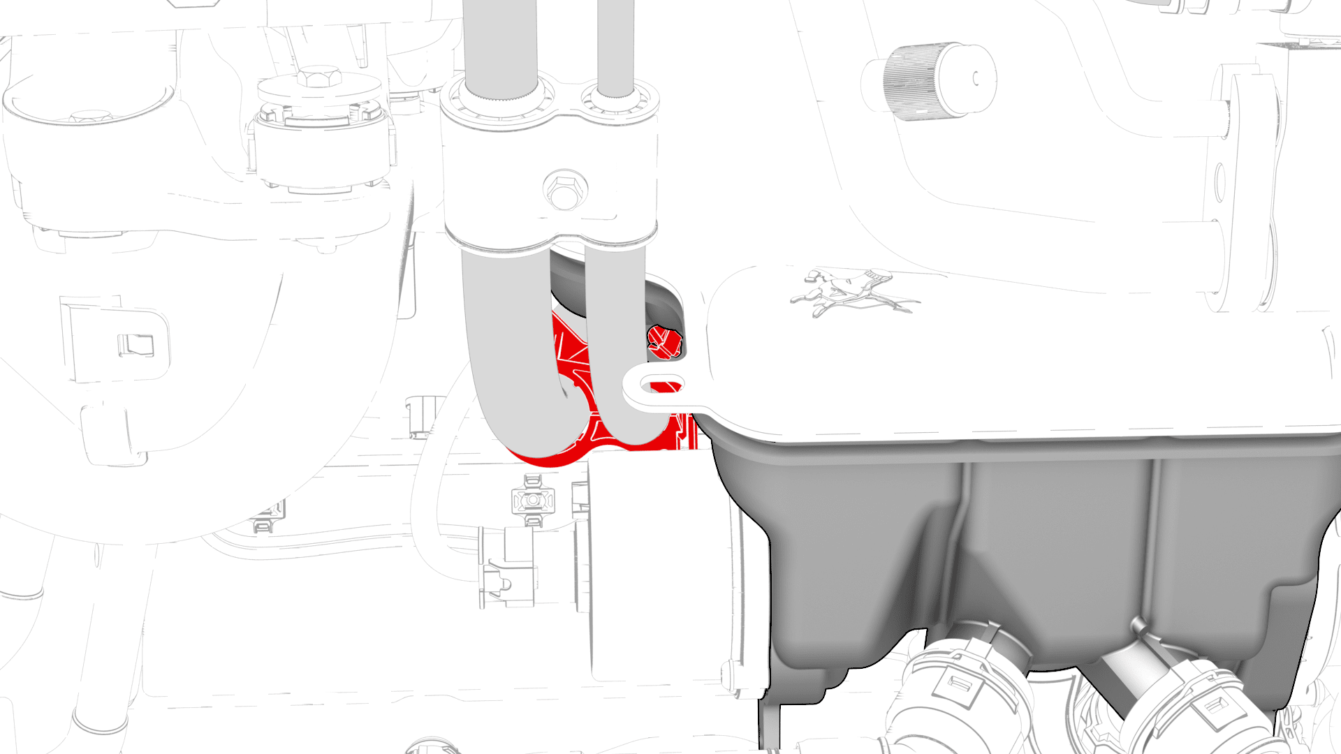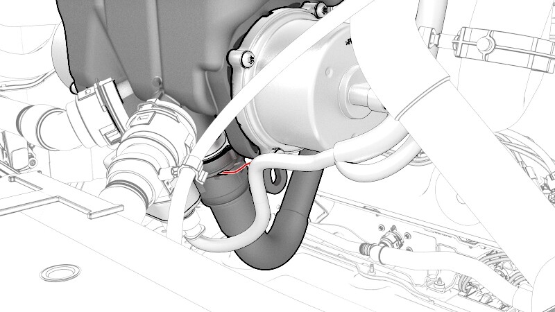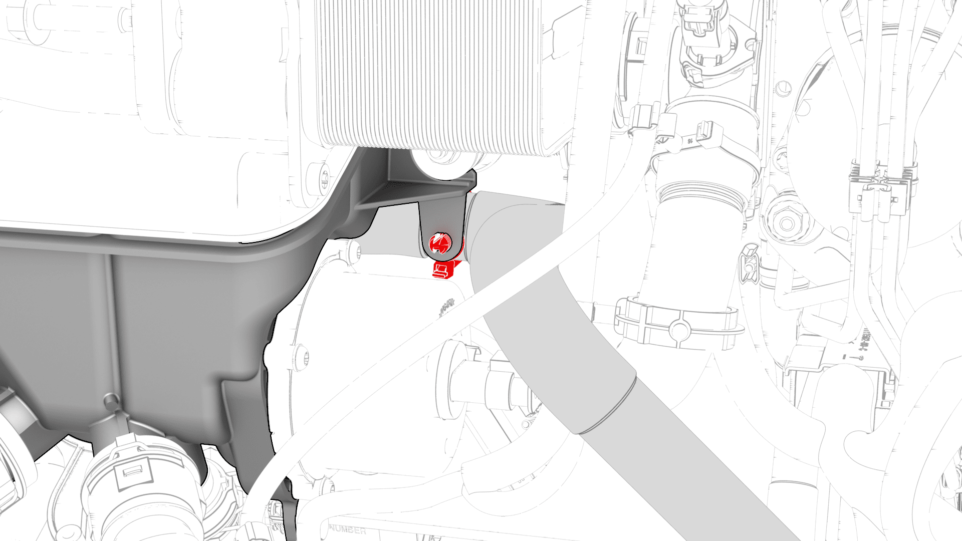 - 将电池回流软管连接到超级瓶左后侧,然后紧固夹子。