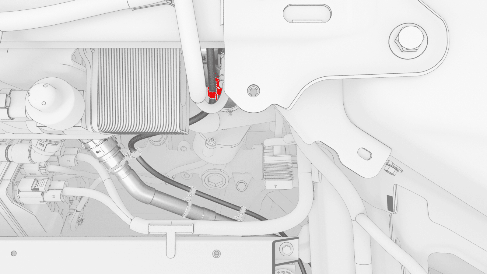 - 将散热器入口软管连接到超级瓶左前侧,然后紧固夹子。