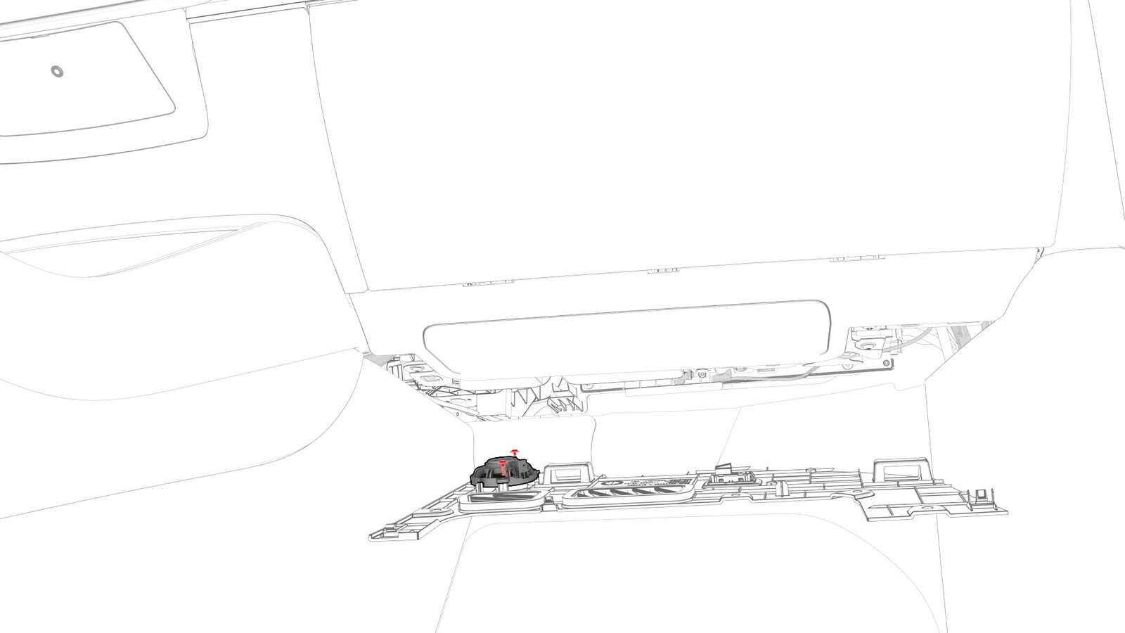 松开将紧急扬声器固定到 RH 脚部空间罩的螺钉,然后拆下紧急扬声器。