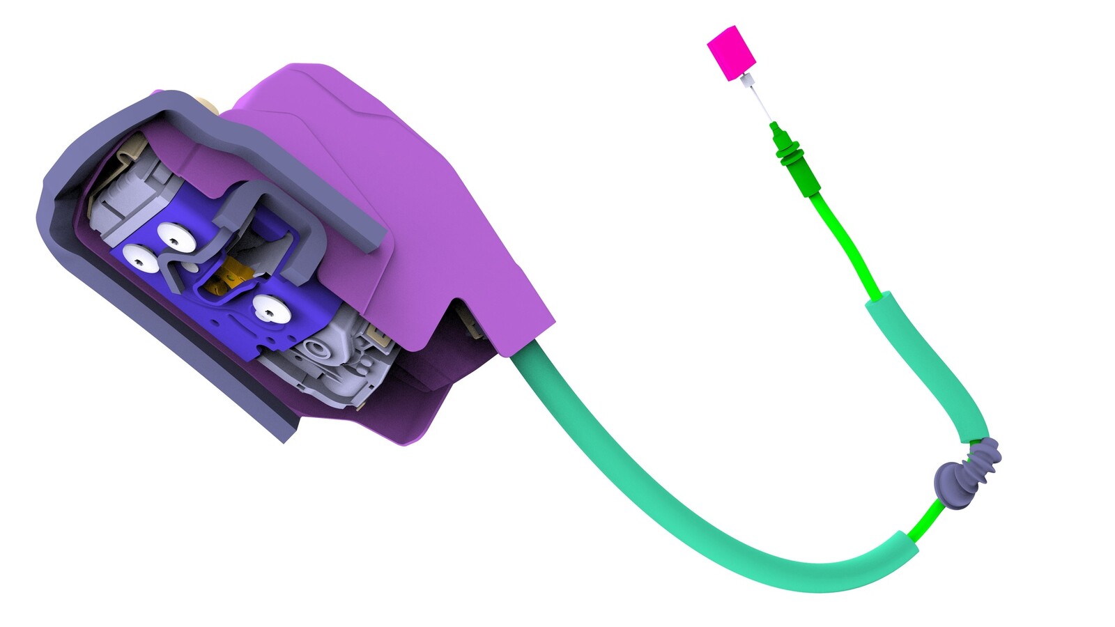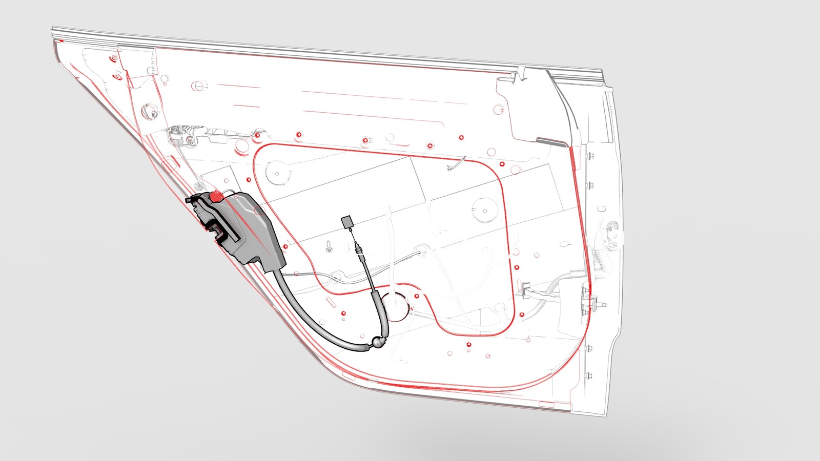 - 将 LH 后车门闩锁安装到 LH 后车门内,与此同时,将闩锁电缆通过车门移出,然后将闩锁电缆索环固定在车门中。