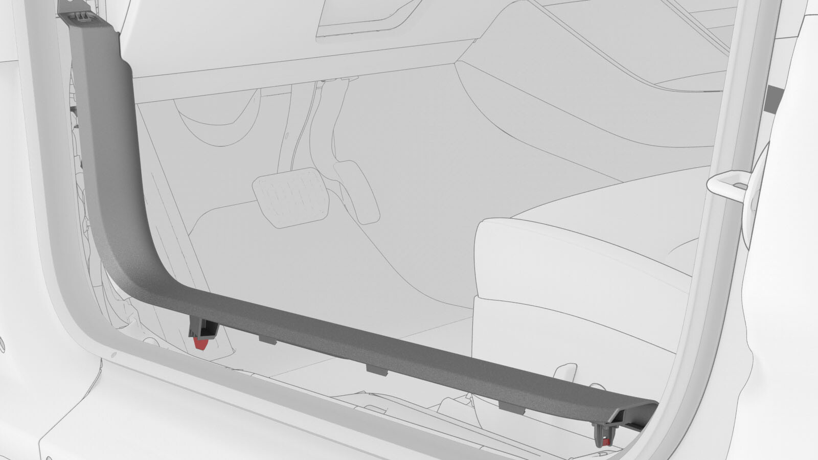 注从 LH A 柱和门槛区域拆下所有剩余的 A 柱 LH 下部饰板夹,如果稍后将安装 A 柱 LH 下部饰板,请拆下全部饰板夹。