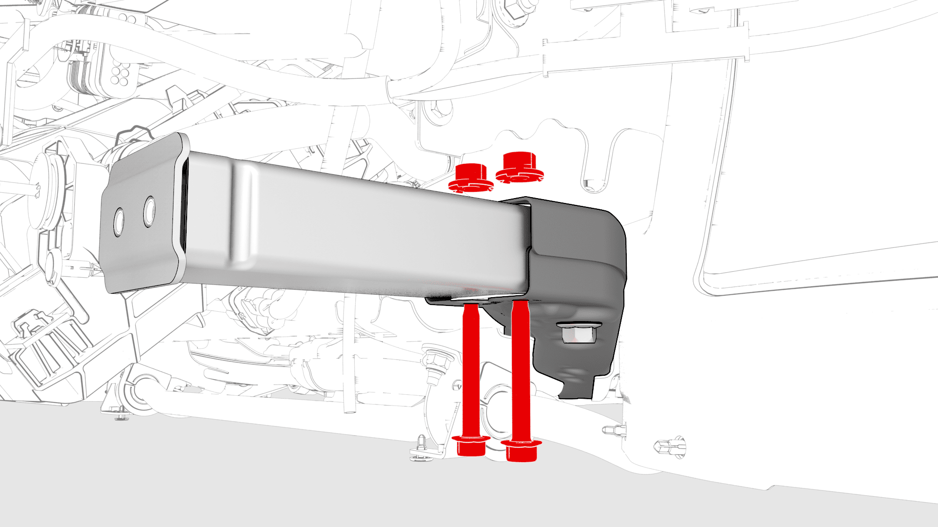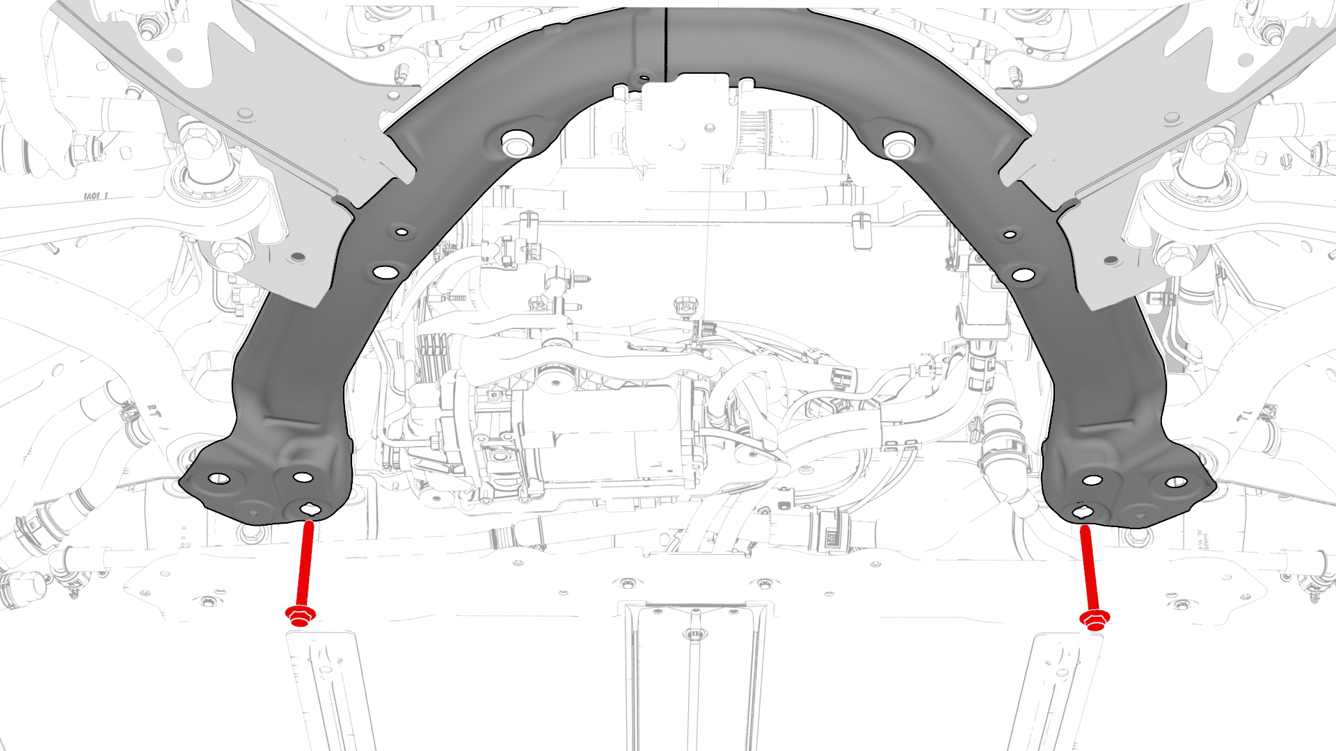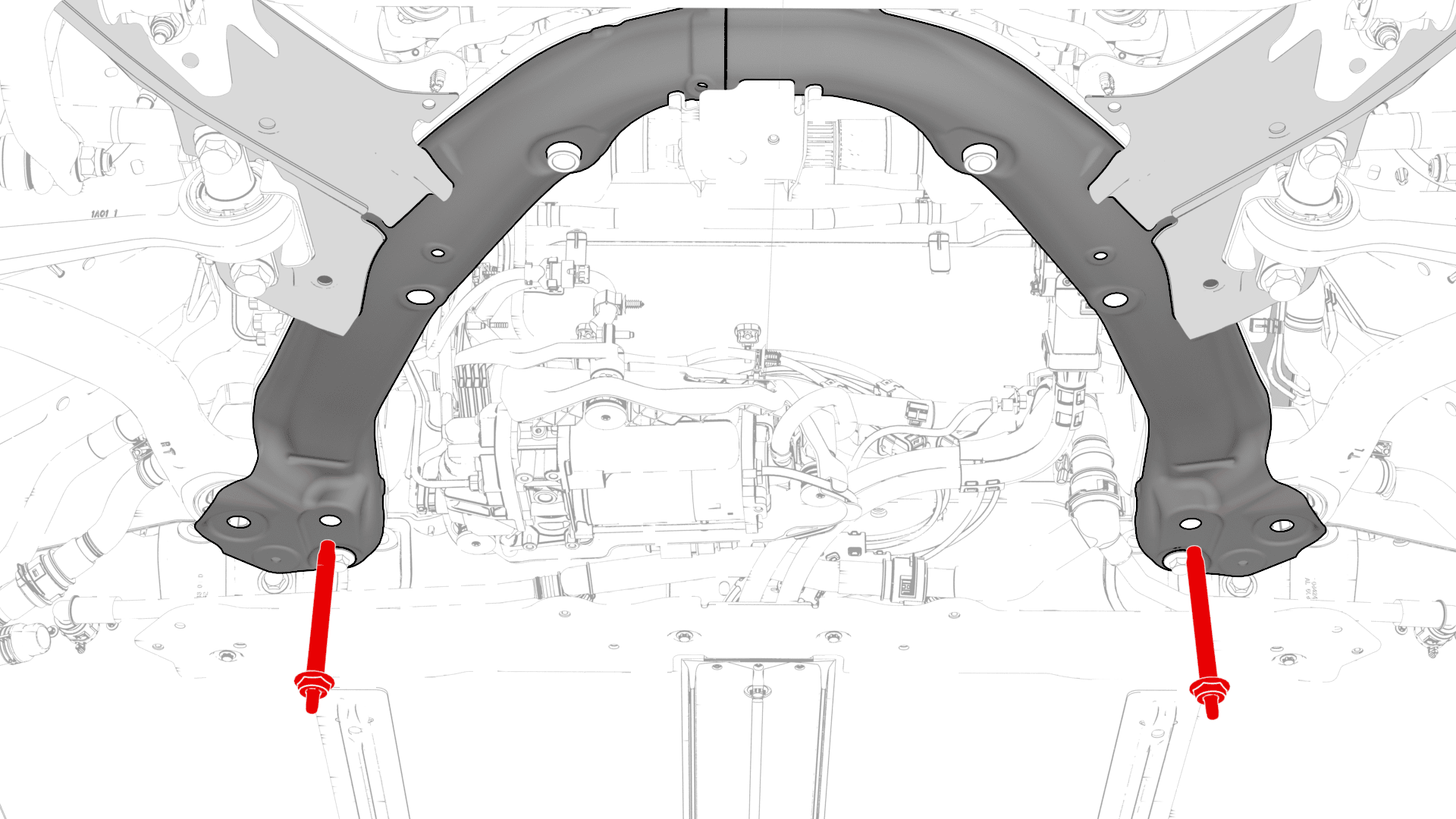 - 用手拧紧将前副框架后部固定到车身的大号螺栓。