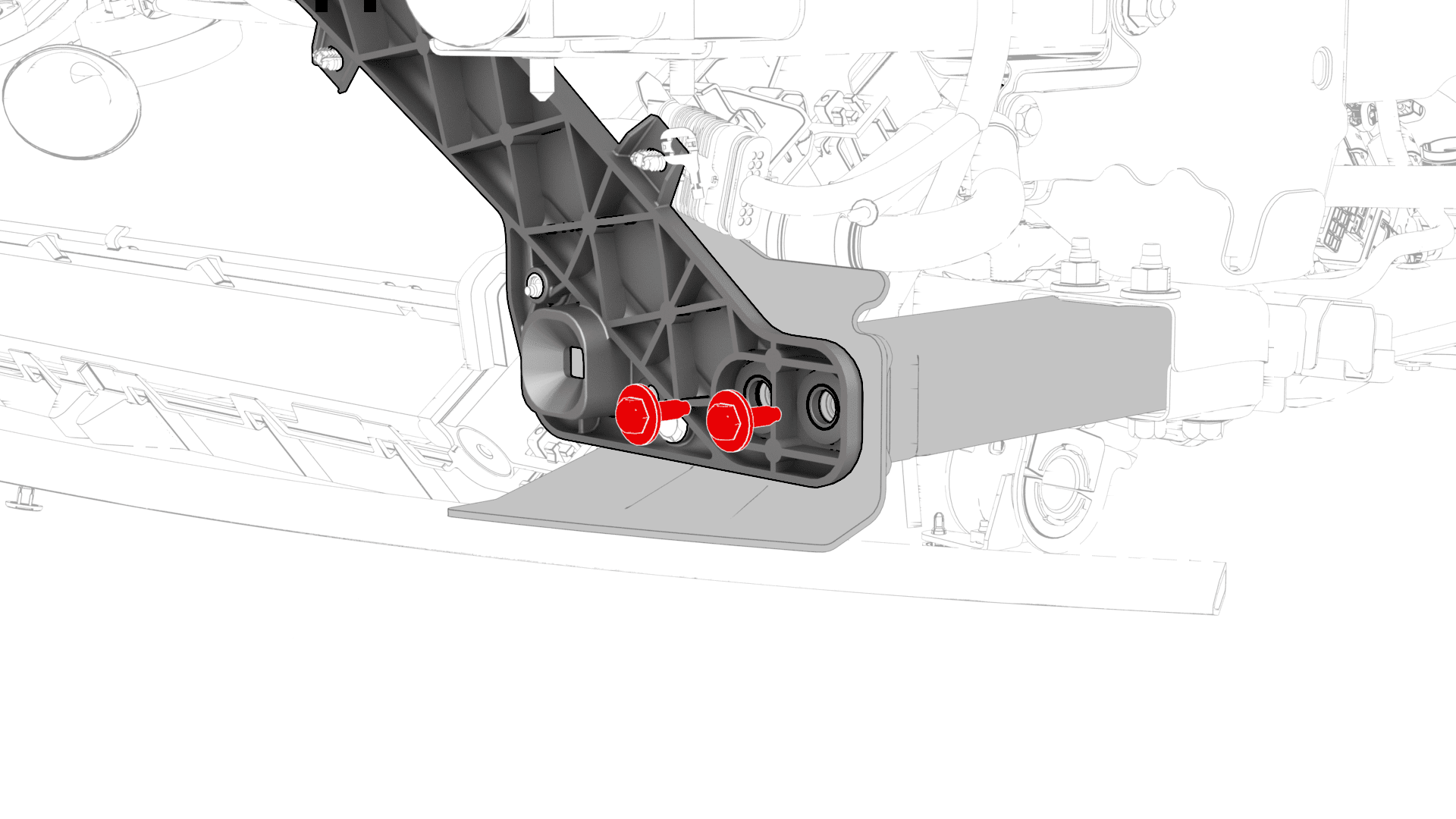 - 拆下将前端支架固定到 LH 和 RH 前副框架防撞罐总成的螺栓。