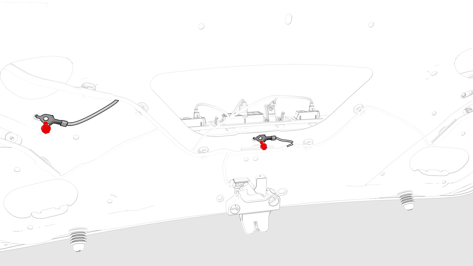 - 拆下并弃用将行李箱线束接地带固定到行李箱盖的螺栓 (x2)。