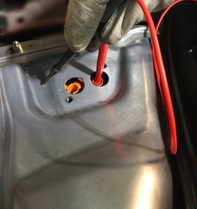 设置万用表以测量电压,然后测量 12V 电池/低压辅助电池端子间的电压。