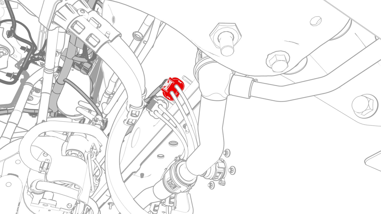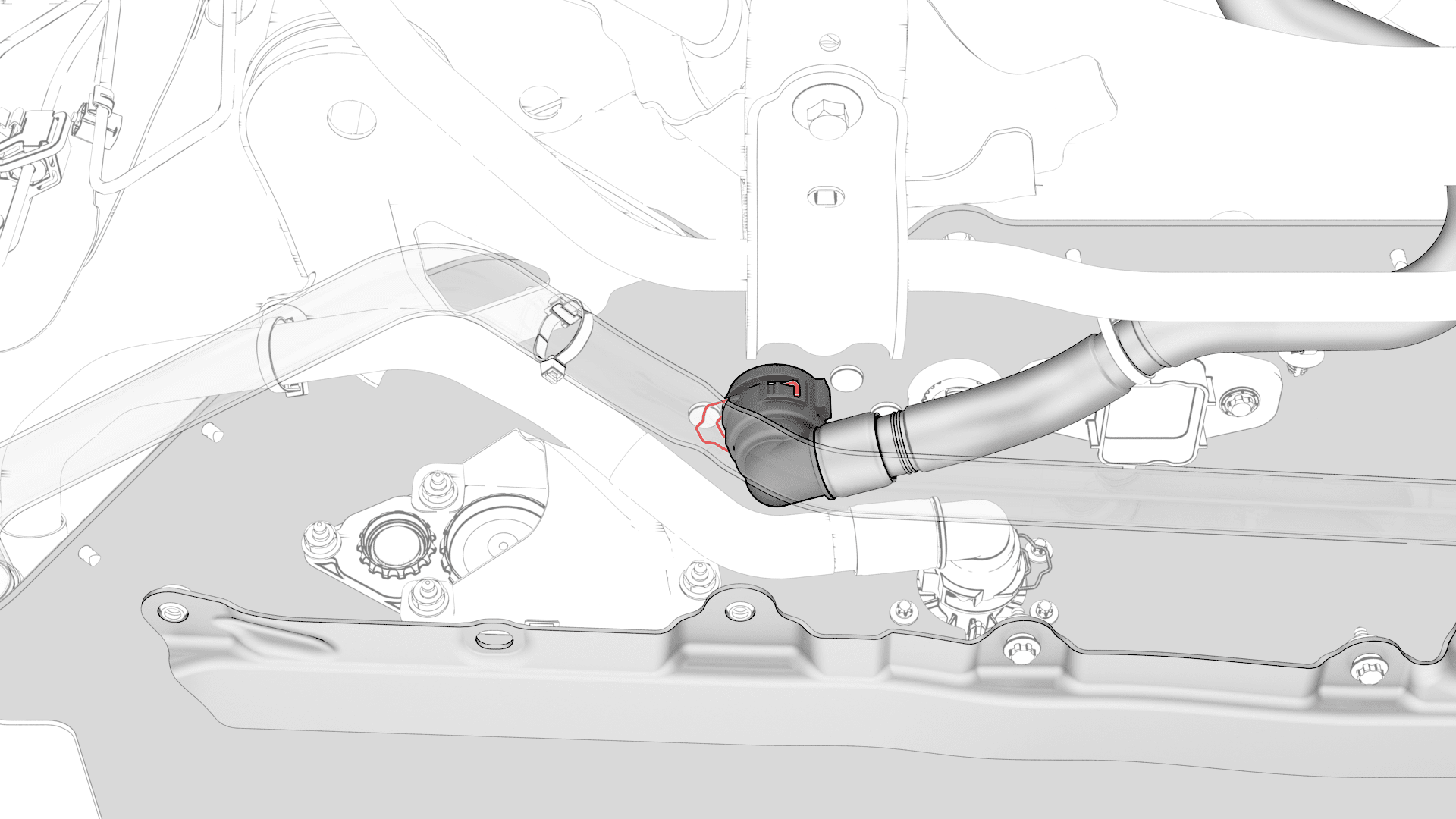 取下车辆右侧动力总成回流软管上的塞子,立即连接外螺纹接头和内螺纹接头,然后紧固卡子。