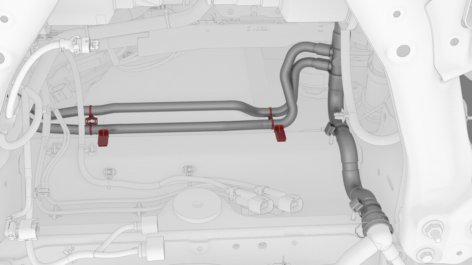 - 松开将冷却器至车载电脑和高压电池电源歧管软管固定到 12V 电池支架梁的夹子。