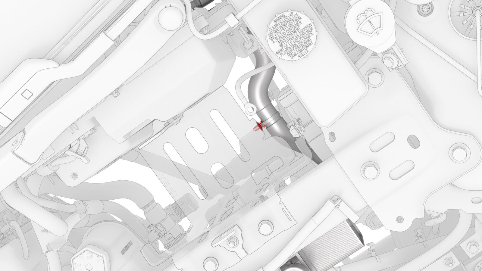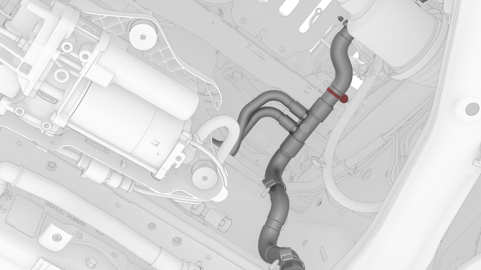 - 松开将 RH 车载电脑冷却液软管连接到车载电脑冷却液端口的夹子,然后断开该软管。