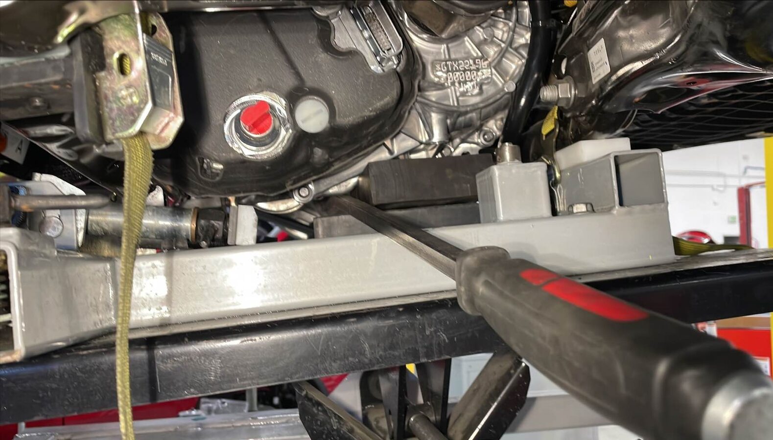 - With the help of an assistant, fully secure the straps (x3) that attach the rear subframe to the subframe lifting tool.