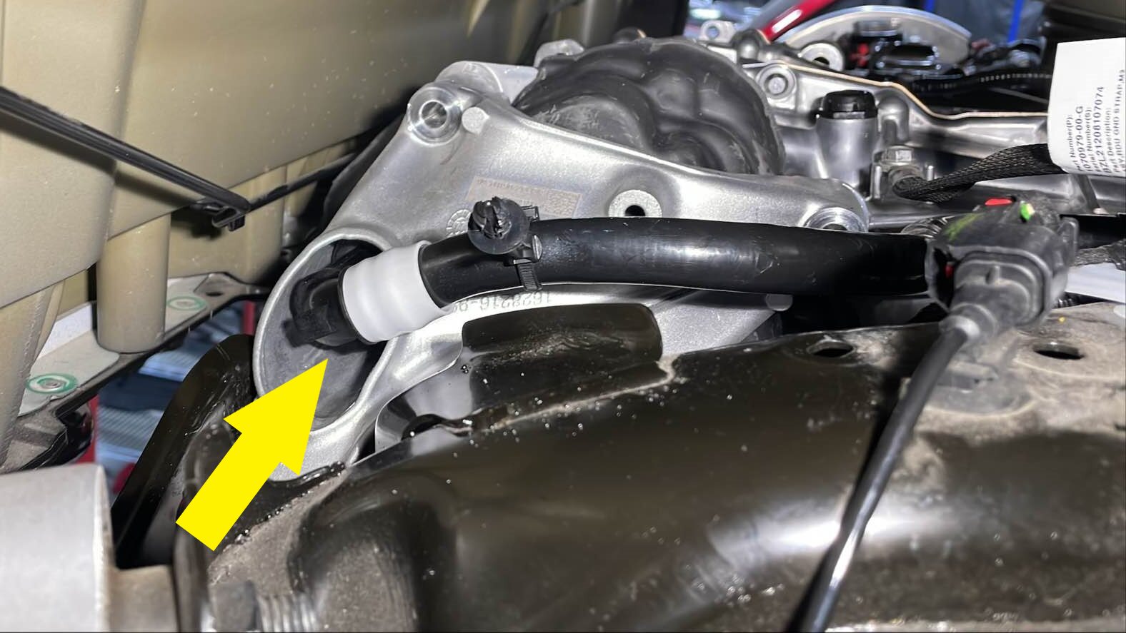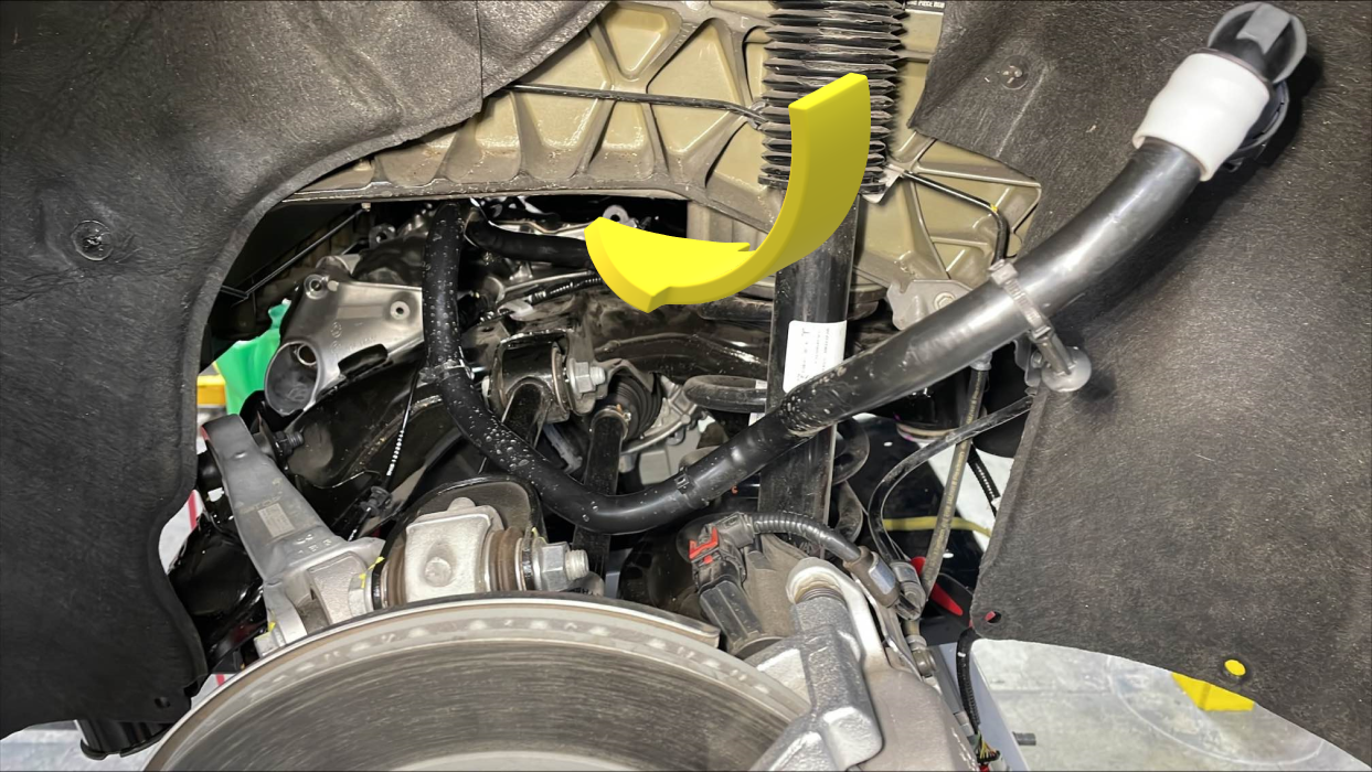 - Raise the rear drive unit inverter to heat exchanger hose up and away from the rear drive unit, then move the hose out through the LH rear wheel well.