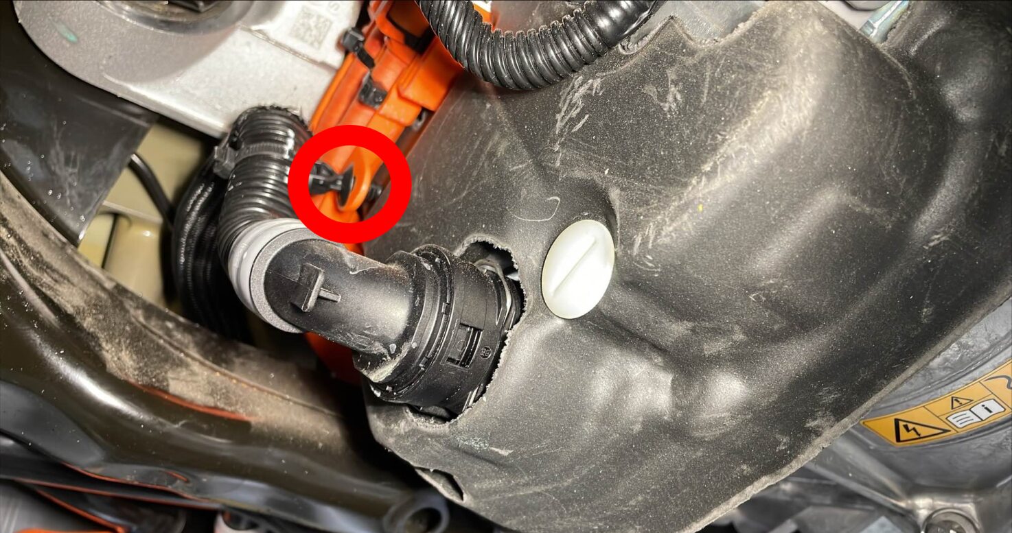 - Release the clip that attaches the rear drive unit inverter inlet hose from rear drive unit HV harness.