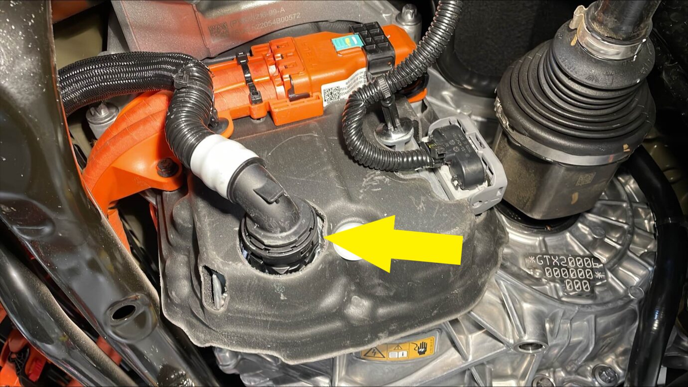 - Remove the rear drive unit inverter inlet hose down and out from between the rear subframe and the HV battery.