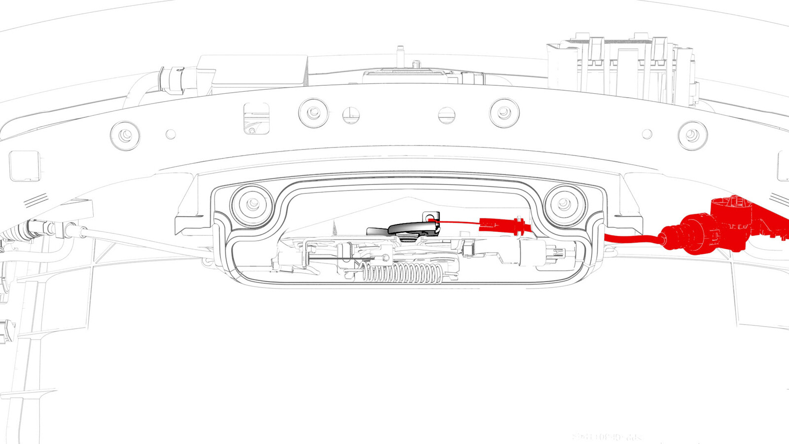 注松开夹子,再从前备箱盖锁臂上拆下盖锁主执行机构缆索。
