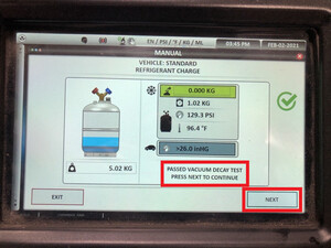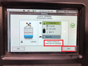 注重新加注制冷剂 1.02 千克(1020 克);对于 Robinair 空调机,按下 ESC 键,点击 “NOT ACCEPT”,不接受清理残留机油的步骤;完成后,按下 “next” 开始“加注结束”流程