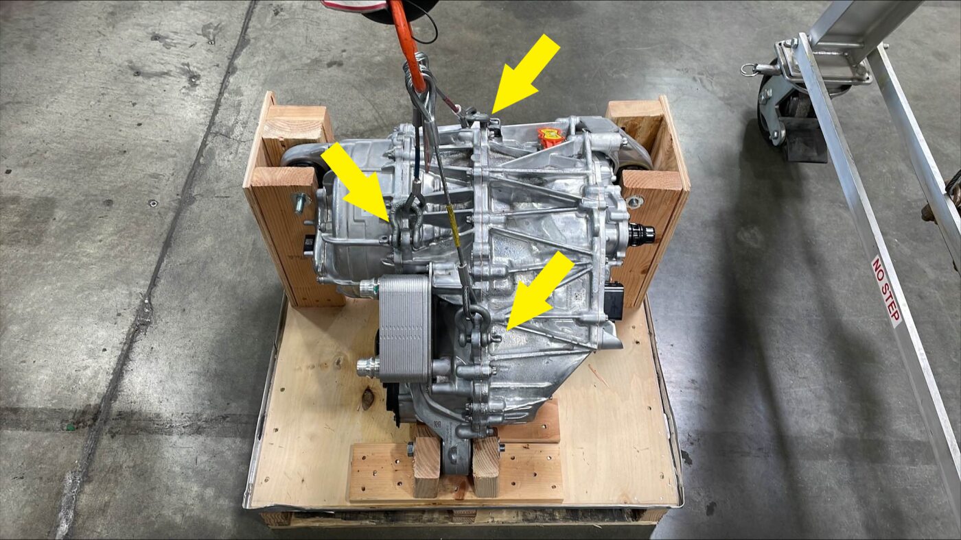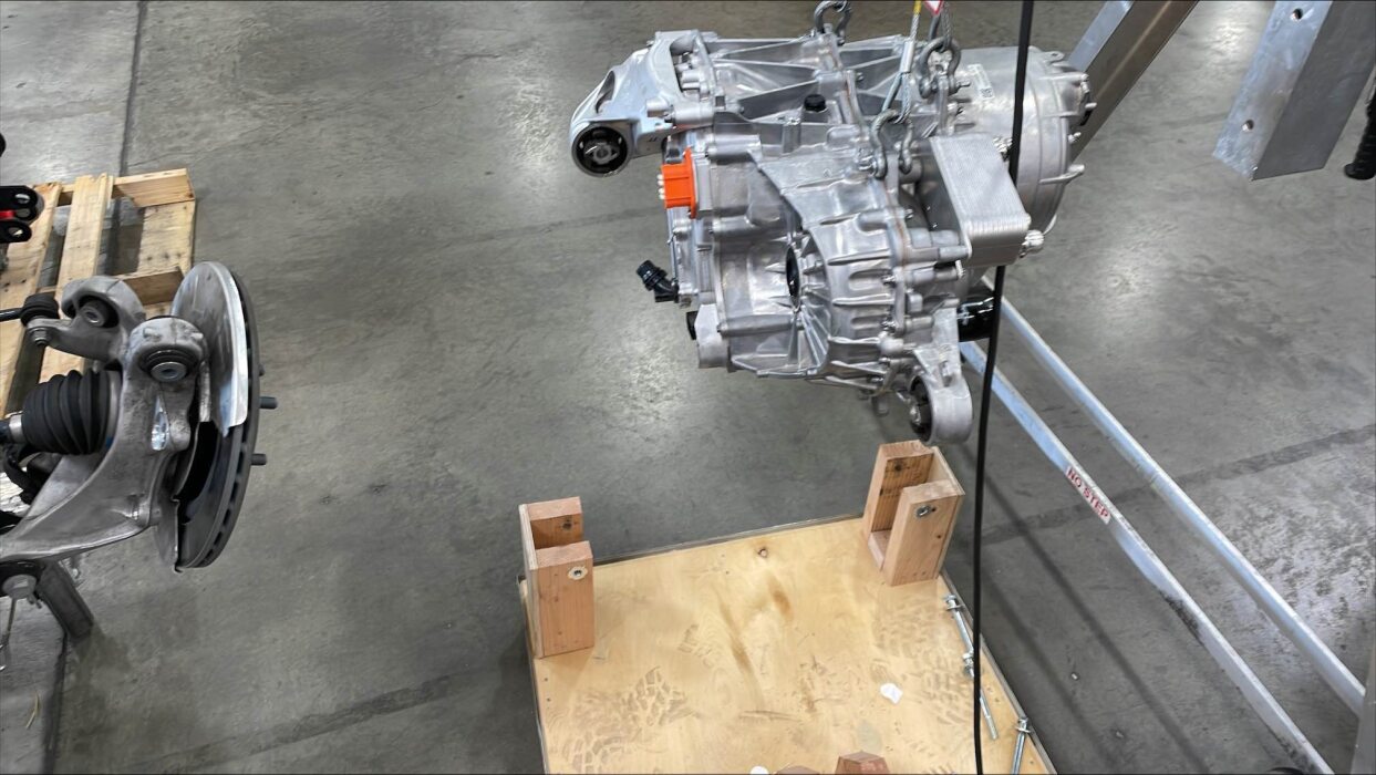 从车上小心地降下后副车架和后驱动单元总成,然后将其从车辆下方移出。