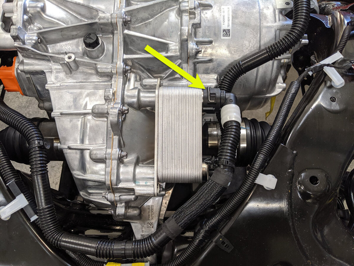 - 将后驱动单元变流器至热交换器软管连接到后驱动单元热交换器,紧固卡子,然后对接头进行推拉推测试。