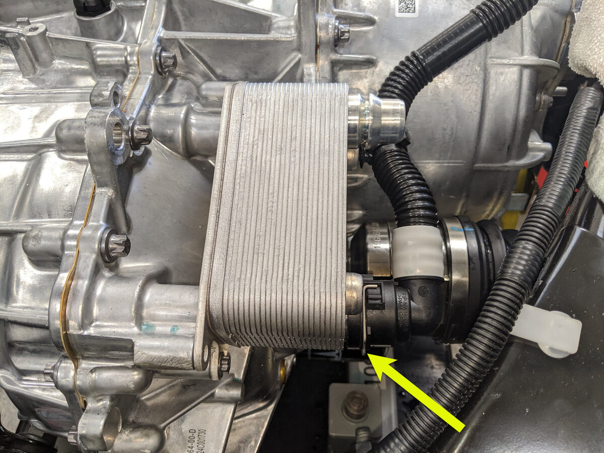 - 将后驱动单元热交换器出口软管连接到后驱动单元热交换器,紧固卡子,然后对接头进行推拉推测试。