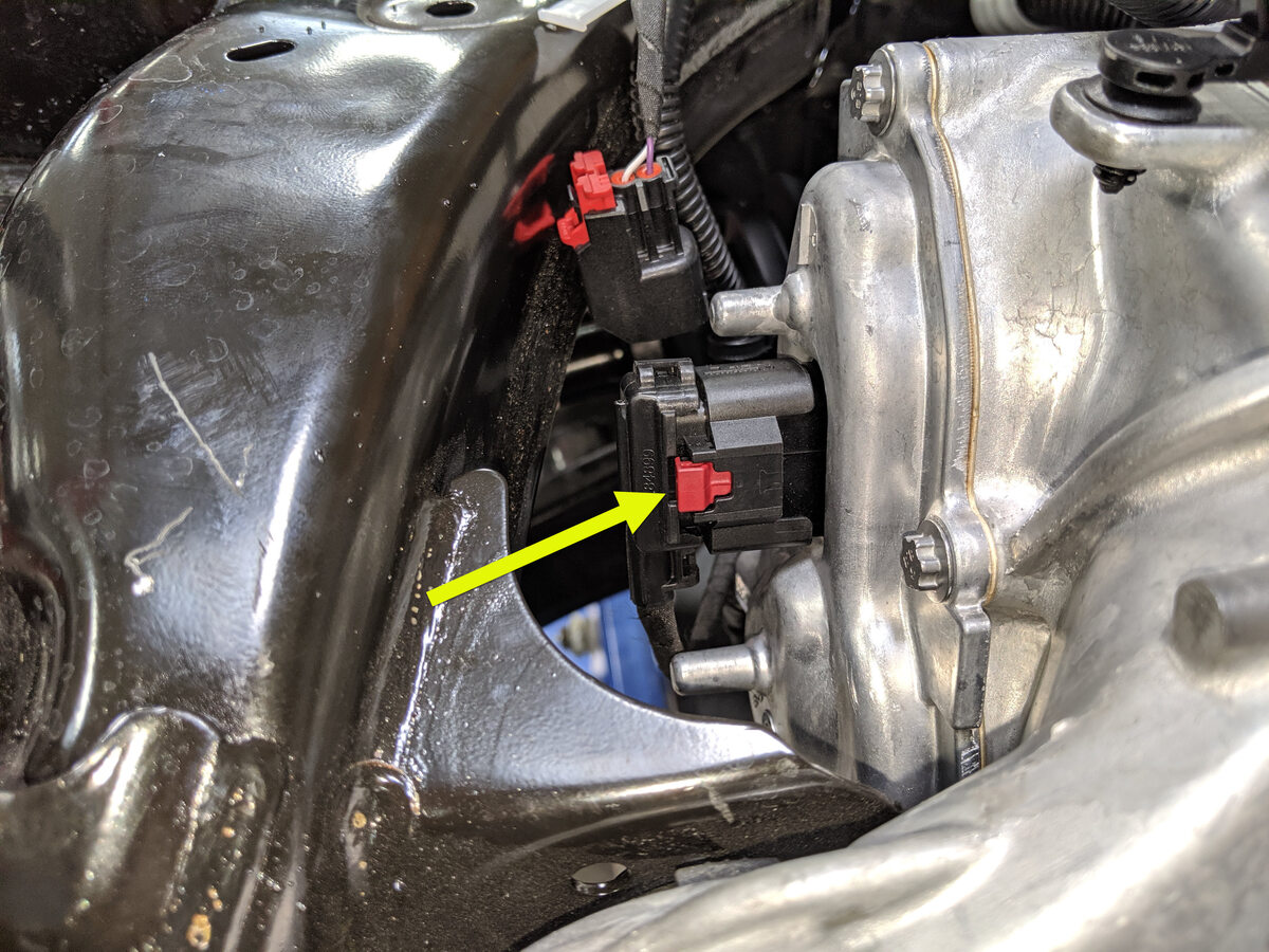 - 拉动红色锁片以松开,然后再次拉动红色锁片以断开后副车架线束与机油泵连接器的连接。