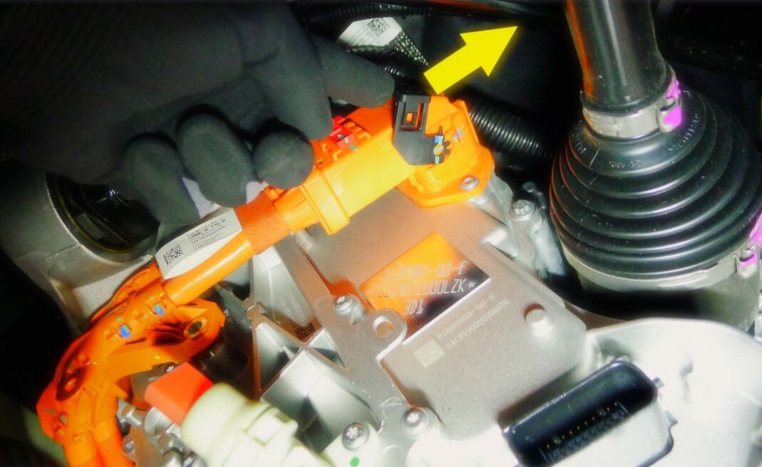 - 滑动红色锁片,抬起黑色手柄,断开后驱动单元高压线束与后驱动单元变流器高压接头的连接,然后将高压线束置于一旁。