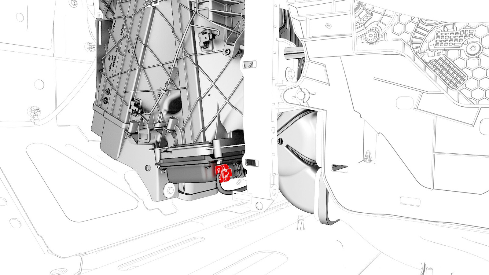 - 拆下将仪表板线束接地带固定到正温度系数加热器旁的螺母(扭矩为 5 Nm)。