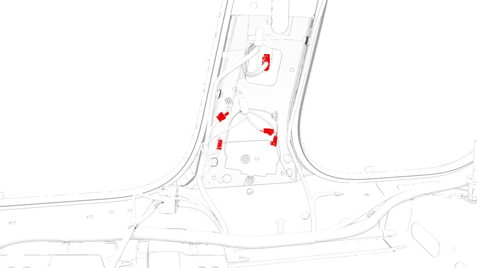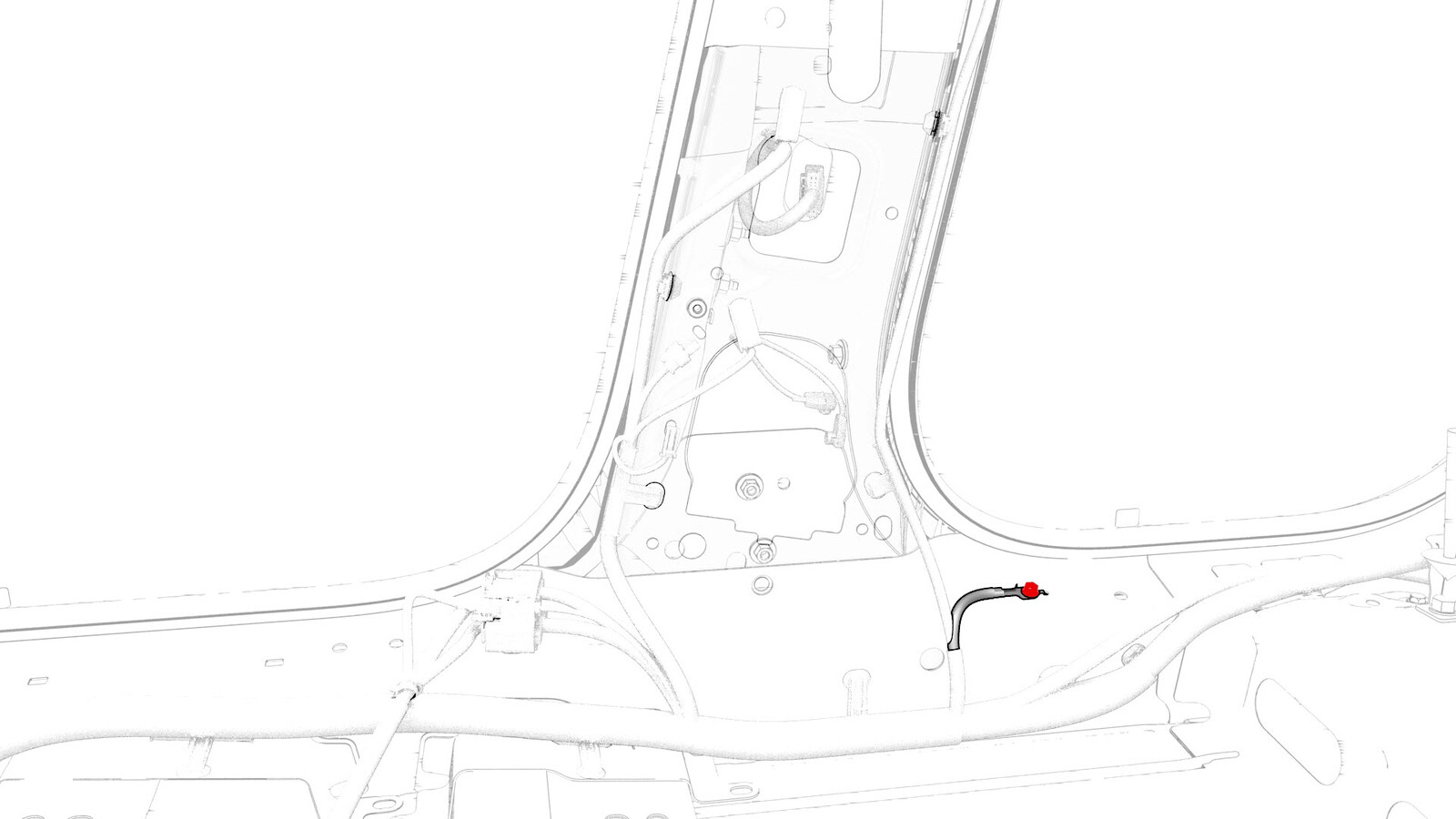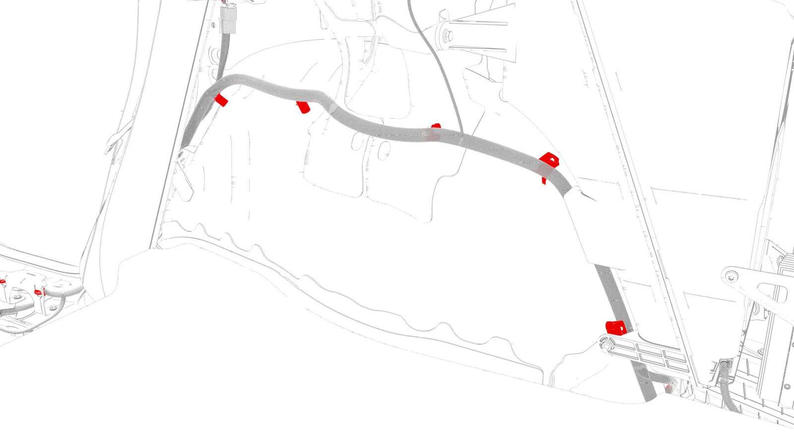 - 在后副框架区域,紧固将电气线束固定到车身的夹子。