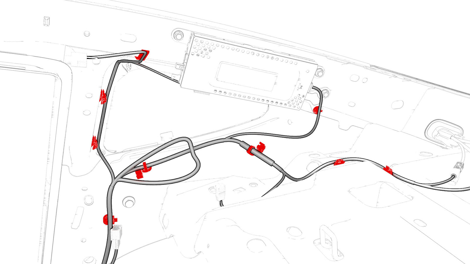 - 在后饰板区域,紧固将电气线束固定到车身的夹子。