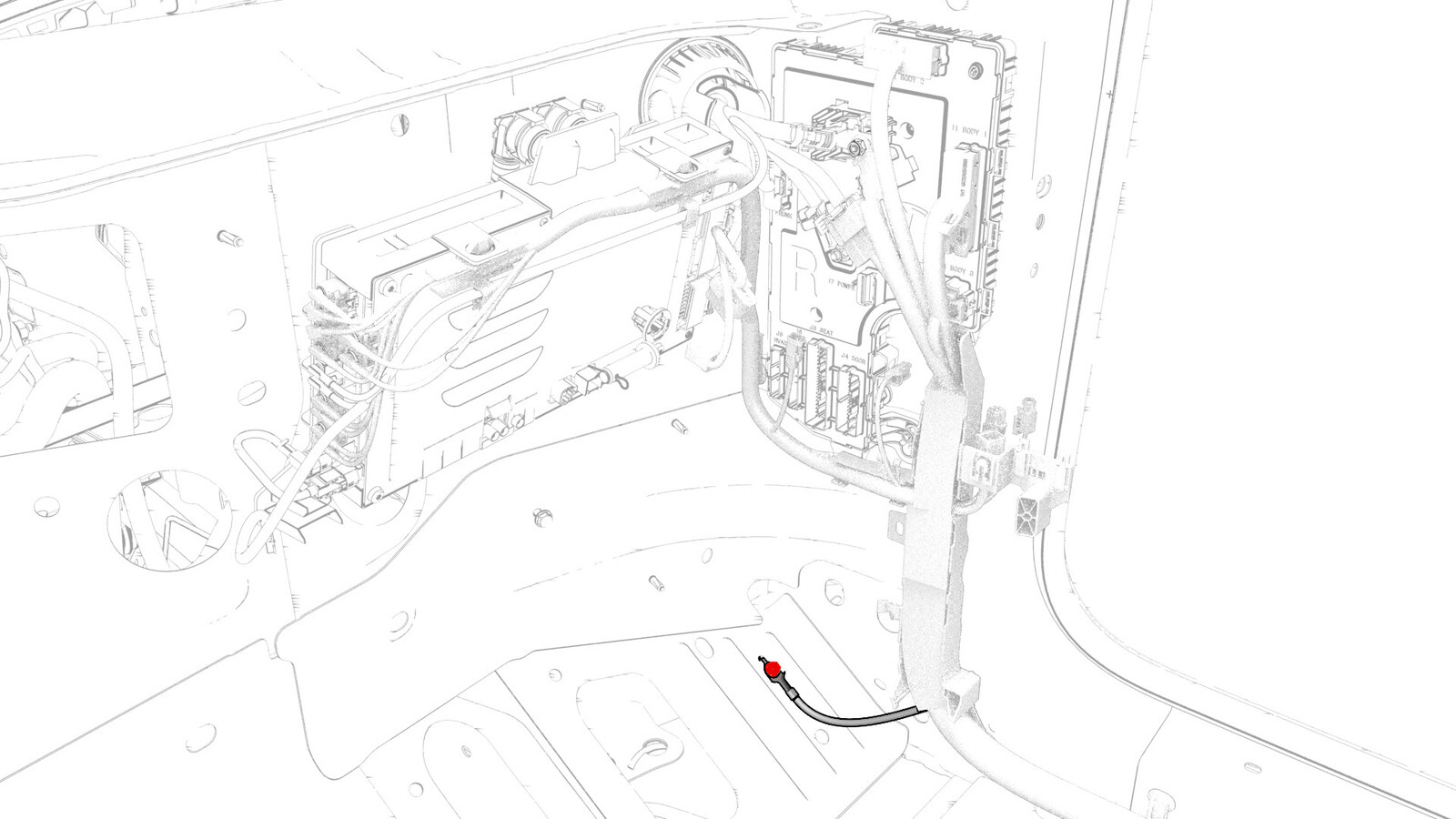 在副驾位脚部空间区域,安装新螺栓,将电气线束接地带固定到车身。