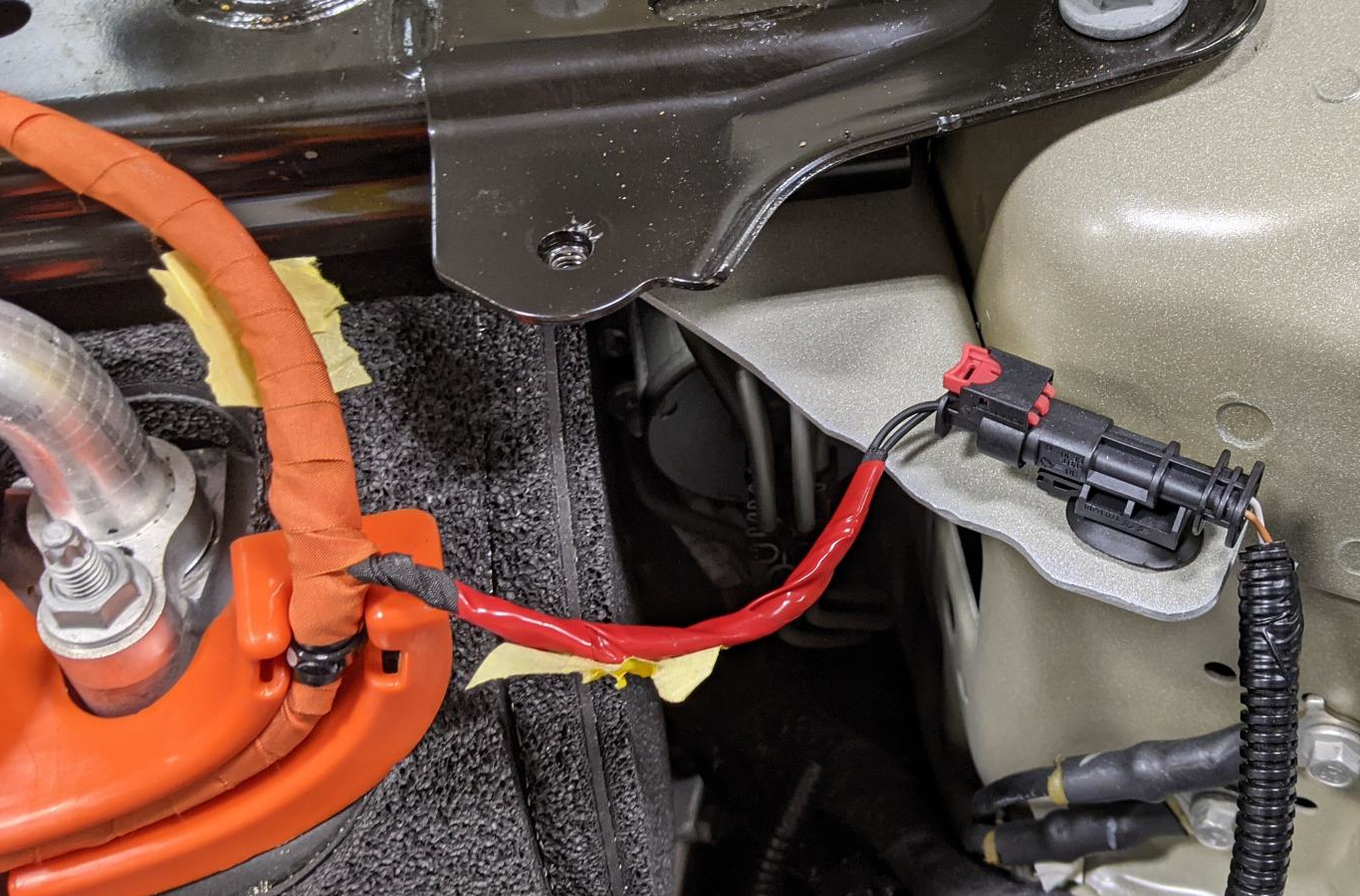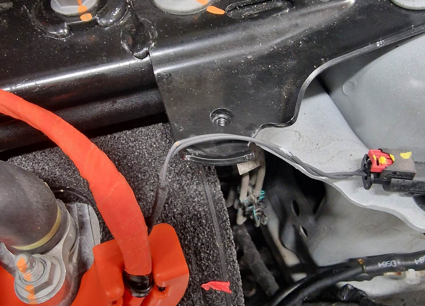 确保空调压缩机高压线束的高压互锁回路线束分支布线正确无误,远离减震塔支架,且并未靠在该支架上。